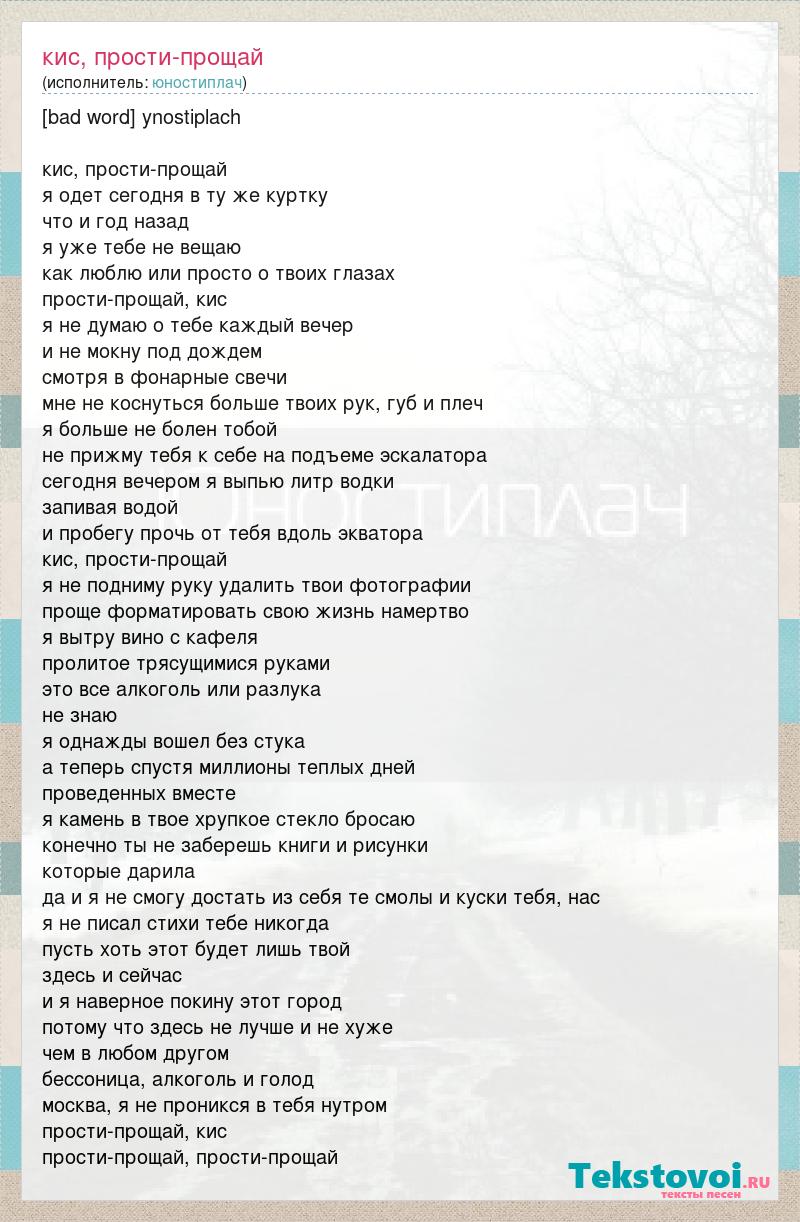 [bad word] ynostiplach кис, прости-прощай я одет сегодня в ту же куртку что и год назад я уже тебе не вещаю как люблю или просто о твоих глазах прости-прощай, кис я не думаю о тебе каждый вечер и не мокну под дождем смотря в фонарные свечи мне не коснуться больше твоих рук, губ и плеч я больше не болен тобой не прижму тебя к себе на подъеме эскалатора сегодня вечером я выпью литр водки запивая водой и пробегу прочь от тебя вдоль экватора кис, прости-прощай я не подниму руку удалить твои фотографии проще форматировать свою жизнь намертво я вытру вино с кафеля пролитое трясущимися руками это все алкоголь или разлука не знаю я однажды вошел без стука а теперь спустя миллионы теплых дней проведенных вместе я камень в твое хрупкое стекло бросаю конечно ты не заберешь книги и рисунки которые дарила да и я не смогу достать из себя те смолы и куски тебя, нас я не писал стихи тебе никогда пусть хоть этот будет лишь твой здесь и сейчас и я наверное покину этот город потому что здесь не лучше и не хуже чем в любом другом бессоница, алкоголь и голод москва, я не проникся в тебя нутром прости-прощай, кис прости-прощай, прости-прощай