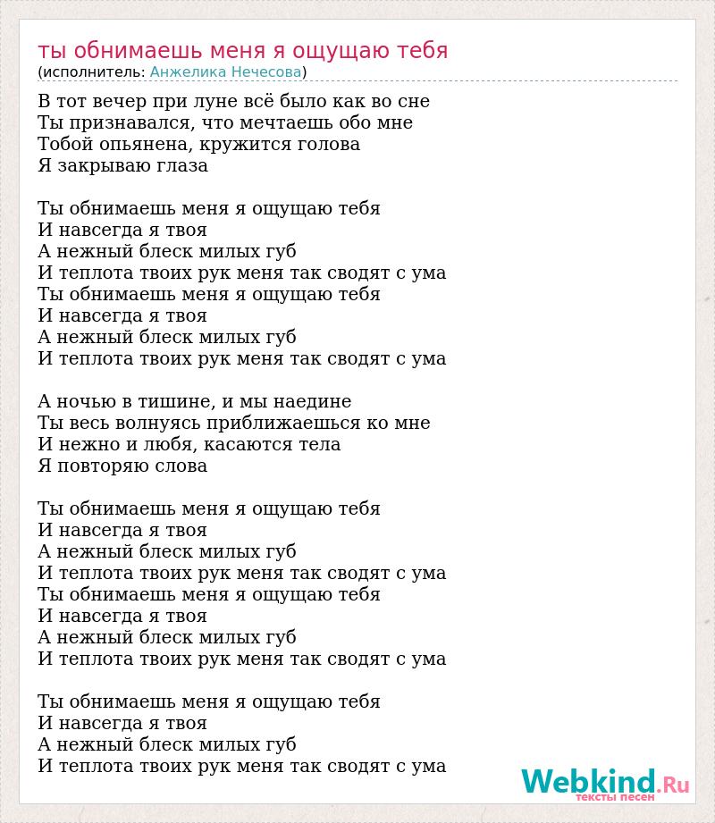 В тот вечер при луне всё было как во сне Ты признавался, что мечтаешь обо мне Тобой опьянена, кружится голова Я закрываю глаза Ты обнимаешь меня я ощущаю тебя И навсегда я твоя А нежный блеск милых губ И теплота твоих рук меня так сводят с ума Ты обнимаешь меня я ощущаю тебя И навсегда я твоя А нежный блеск милых губ И теплота твоих рук меня так сводят с ума А ночью в тишине, и мы наедине Ты весь волнуясь приближаешься ко мне И нежно и любя, касаются тела Я повторяю слова Ты обнимаешь меня я ощущаю тебя И навсегда я твоя А нежный блеск милых губ И теплота твоих рук меня так сводят с ума Ты обнимаешь меня я ощущаю тебя И навсегда я твоя А нежный блеск милых губ И теплота твоих рук меня так сводят с ума Ты обнимаешь меня я ощущаю тебя И навсегда я твоя А нежный блеск милых губ И теплота твоих рук меня так сводят с ума