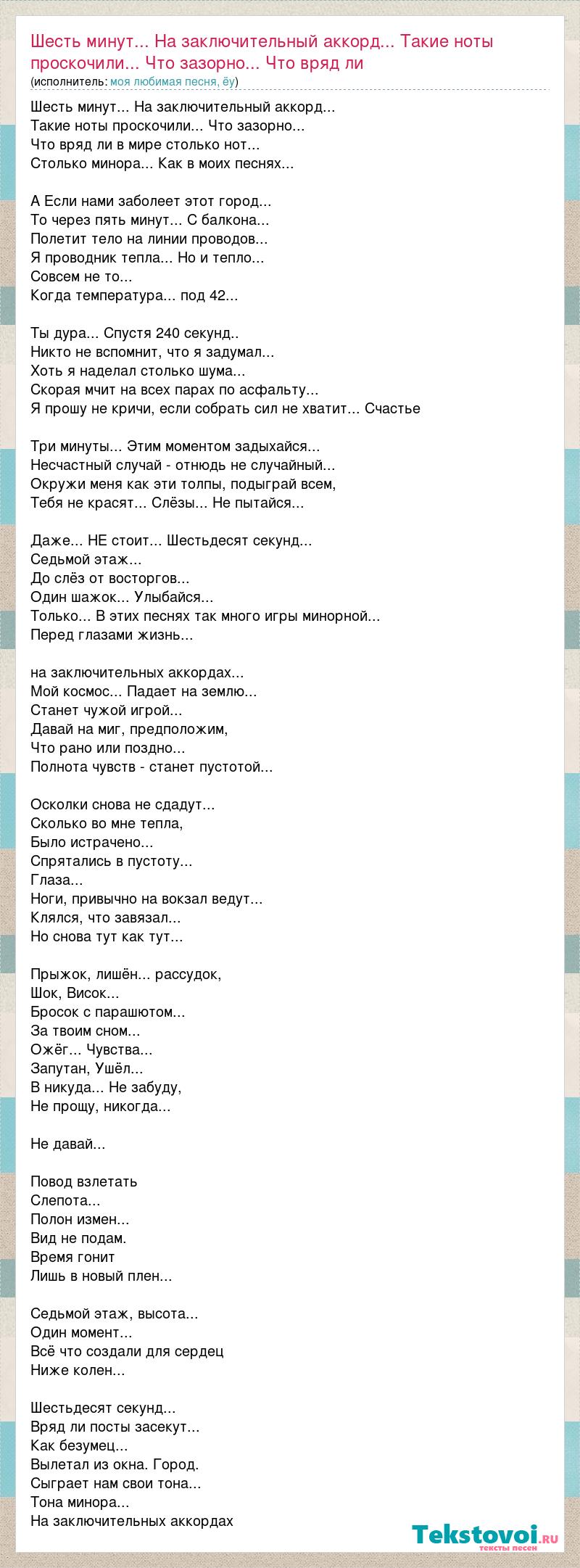 Шесть минут... На заключительный аккорд... Такие ноты проскочили... Что зазорно... Что вряд ли в мире столько нот... Столько минора... Как в моих песнях... А Если нами заболеет этот город... То через пять минут... С балкона... Полетит тело на линии проводов... Я проводник тепла... Но и тепло... Совсем не то... Когда температура... под 42... Ты дура... Спустя 240 секунд.. Никто не вспомнит, что я задумал... Хоть я наделал столько шума... Скорая мчит на всех парах по асфальту... Я прошу не кричи, если собрать сил не хватит... Счастье Три минуты... Этим моментом задыхайся... Несчастный случай - отнюдь не случайный... Окружи меня как эти толпы, подыграй всем, Тебя не красят... Слёзы... Не пытайся... Даже... НЕ стоит... Шестьдесят секунд... Седьмой этаж... До слёз от восторгов... Один шажок... Улыбайся... Только... В этих песнях так много игры минорной... Перед глазами жизнь... на заключительных аккордах... Мой космос... Падает на землю... Станет чужой игрой... Давай на миг, предположим, Что рано или поздно... Полнота чувств - станет пустотой... Осколки снова не сдадут... Сколько во мне тепла, Было истрачено... Спрятались в пустоту... Глаза... Ноги, привычно на вокзал ведут... Клялся, что завязал... Но снова тут как тут... Прыжок, лишён... рассудок, Шок, Висок... Бросок с парашютом... За твоим сном... Ожёг... Чувства... Запутан, Ушёл... В никуда... Не забуду, Не прощу, никогда... Не давай... Повод взлетать Слепота... Полон измен... Вид не подам. Время гонит Лишь в новый плен... Седьмой этаж, высота... Один момент... Всё что создали для сердец Ниже колен... Шестьдесят секунд... Вряд ли посты засекут... Как безумец... Вылетал из окна. Город. Сыграет нам свои тона... Тона минора... На заключительных аккордах