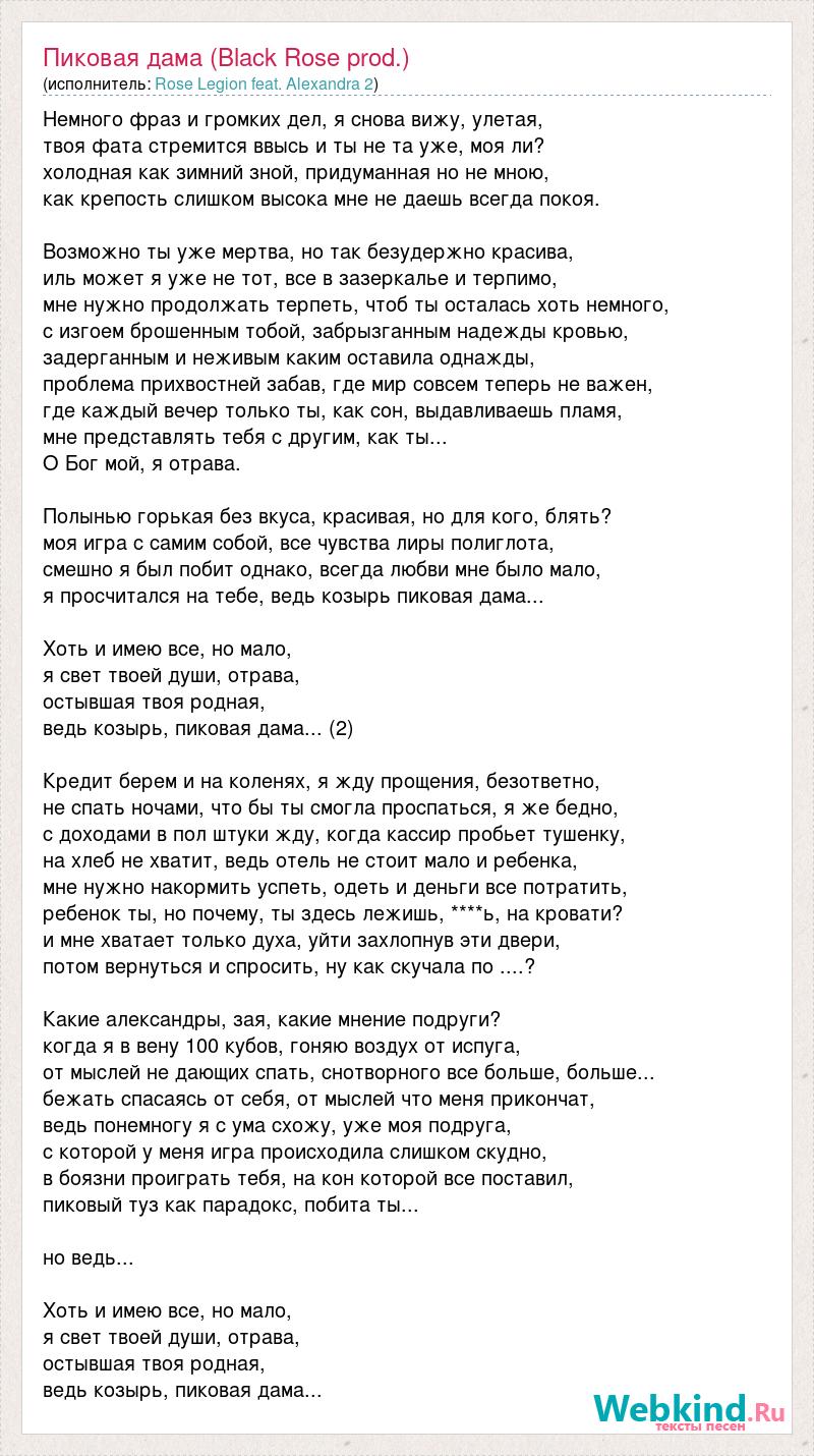 Немного фраз и громких дел, я снова вижу, улетая, твоя фата стремится ввысь и ты не та уже, моя ли? холодная как зимний зной, придуманная но не мною, как крепость слишком высока мне не даешь всегда покоя. Возможно ты уже мертва, но так безудержно красива, иль может я уже не тот, все в зазеркалье и терпимо, мне нужно продолжать терпеть, чтоб ты осталась хоть немного, с изгоем брошенным тобой, забрызганным надежды кровью, задерганным и неживым каким оставила однажды, проблема прихвостней забав, где мир совсем теперь не важен, где каждый вечер только ты, как сон, выдавливаешь пламя, мне представлять тебя с другим, как ты... О Бог мой, я отрава. Полынью горькая без вкуса, красивая, но для кого, блять? моя игра с самим собой, все чувства лиры полиглота, смешно я был побит однако, всегда любви мне было мало, я просчитался на тебе, ведь козырь пиковая дама... Хоть и имею все, но мало, я свет твоей души, отрава, остывшая твоя родная, ведь козырь, пиковая дама... (2) Кредит берем и на коленях, я жду прощения, безответно, не спать ночами, что бы ты смогла проспаться, я же бедно, с доходами в пол штуки жду, когда кассир пробьет тушенку, на хлеб не хватит, ведь отель не стоит мало и ребенка, мне нужно накормить успеть, одеть и деньги все потратить, ребенок ты, но почему, ты здесь лежишь, ****ь, на кровати? и мне хватает только духа, уйти захлопнув эти двери, потом вернуться и спросить, ну как скучала по ....? Какие александры, зая, какие мнение подруги? когда я в вену 100 кубов, гоняю воздух от испуга, от мыслей не дающих спать, снотворного все больше, больше... бежать спасаясь от себя, от мыслей что меня прикончат, ведь понемногу я с ума схожу, уже моя подруга, с которой у меня игра происходила слишком скудно, в боязни проиграть тебя, на кон которой все поставил, пиковый туз как парадокс, побита ты... но ведь... Хоть и имею все, но мало, я свет твоей души, отрава, остывшая твоя родная, ведь козырь, пиковая дама...