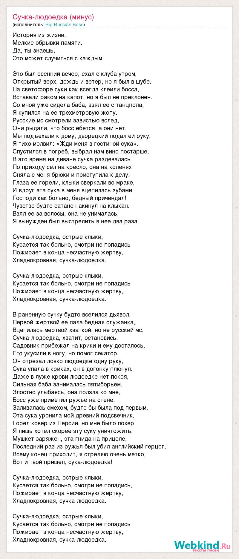 История из жизни. Мелкие обрывки памяти. Да, ты знаешь, Это может случиться с каждым Это был осенний вечер, ехал с клуба утром, Открытый верх, дождь и ветер, но я был в шубе. На светофоре суки как всегда клеили босса, Вставали раком на капот, но я был не преклонен. Со мной уже сидела баба, взял ее с танцпола, Я купился на ее трехметровую жопу. Русские мс смотрели завистью вслед, Они рыдали, что босс ебется, а они нет. Мы подъехали к дому, дворецкий подал ей руку, Я тихо молвил: «Жди меня в гостиной сука». Спустился в погреб, выбрал нам вино постарше, В это время на диване сучка раздевалась. По приходу сел на кресло, она на коленях Сняла с меня брюки и приступила к делу. Глаза ее горели, клыки сверкали во мраке, И вдруг эта сука в меня вцепилась зубами. Господи как больно, бедный причендал! Чувство будто сатане накинул на клыкан. Взял ее за волосы, она не унималась, Я вынужден был выстрелить в нее два раза. Сучка-людоедка, острые клыки, Кусается так больно, смотри не попадись Пожирает в конца несчастную жертву, Хладнокровная, сучка-людоедка. Сучка-людоедка, острые клыки, Кусается так больно, смотри не попадись Пожирает в конца несчастную жертву, Хладнокровная, сучка-людоедка. В раненную сучку будто вселился дьявол, Первой жертвой ее пала бедная служанка, Вцепилась мертвой хваткой, но не русский мс, Сучка-людоедка, хватит, остановись. Садовник прибежал на крики и ему досталось, Его укусили в ногу, но помог секатор, Он отрезал ловко людоедке одну руку, Сука упала в криках, он в догонку плюнул. Даже в луже крови людоедке нет покоя, Сильная баба занималась пятиборьем. Злостно улыбаясь, она ползла ко мне, Босс уже приметил ружье на стене. Заливалась смехом, будто бы была под первым, Эта сука уронила мой древний подсвечник, Горел ковер из Персии, но мне было похер Я лишь хотел скорее эту суку уничтожить. Мушкет заряжен, эта гнида на прицеле, Последний раз из ружья был убил английский герцог, Всему конец приходит, я стреляю очень метко, Вот и твой пришел, сука-людоедка! Сучка-людоедка, острые клыки, Кусается так больно, смотри не попадись, Пожирает в конца несчастную жертву, Хладнокровная, сучка-людоедка. Сучка-людоедка, острые клыки, Кусается так больно, смотри не попадись Пожирает в конца несчастную жертву, Хладнокровная, сучка-людоедка.