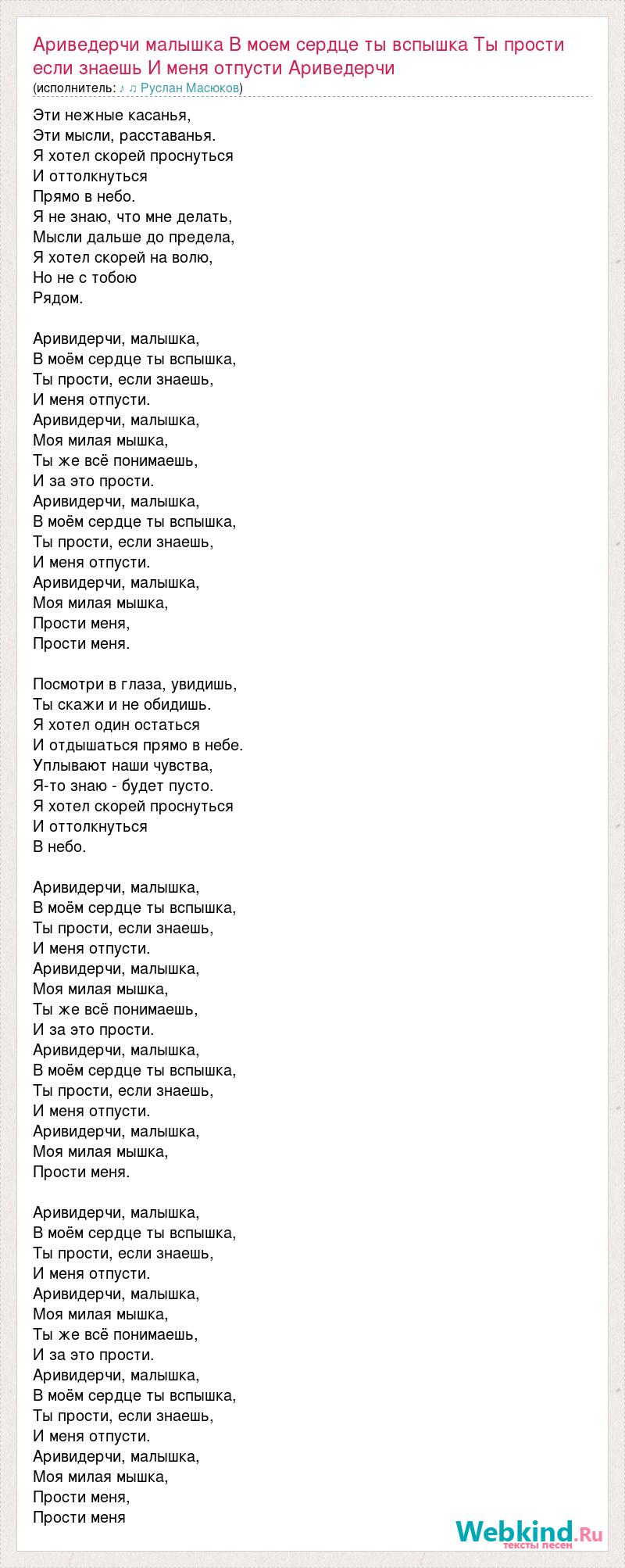 Эти нежные касанья, Эти мысли, расставанья. Я хотел скорей проснуться И оттолкнуться Прямо в небо. Я не знаю, что мне делать, Мысли дальше до предела, Я хотел скорей на волю, Но не с тобою Рядом. Аривидерчи, малышка, В моём сердце ты вспышка, Ты прости, если знаешь, И меня отпусти. Аривидерчи, малышка, Моя милая мышка, Ты же всё понимаешь, И за это прости. Аривидерчи, малышка, В моём сердце ты вспышка, Ты прости, если знаешь, И меня отпусти. Аривидерчи, малышка, Моя милая мышка, Прости меня, Прости меня. Посмотри в глаза, увидишь, Ты скажи и не обидишь. Я хотел один остаться И отдышаться прямо в небе. Уплывают наши чувства, Я-то знаю - будет пусто. Я хотел скорей проснуться И оттолкнуться В небо. Аривидерчи, малышка, В моём сердце ты вспышка, Ты прости, если знаешь, И меня отпусти. Аривидерчи, малышка, Моя милая мышка, Ты же всё понимаешь, И за это прости. Аривидерчи, малышка, В моём сердце ты вспышка, Ты прости, если знаешь, И меня отпусти. Аривидерчи, малышка, Моя милая мышка, Прости меня. Аривидерчи, малышка, В моём сердце ты вспышка, Ты прости, если знаешь, И меня отпусти. Аривидерчи, малышка, Моя милая мышка, Ты же всё понимаешь, И за это прости. Аривидерчи, малышка, В моём сердце ты вспышка, Ты прости, если знаешь, И меня отпусти. Аривидерчи, малышка, Моя милая мышка, Прости меня, Прости меня