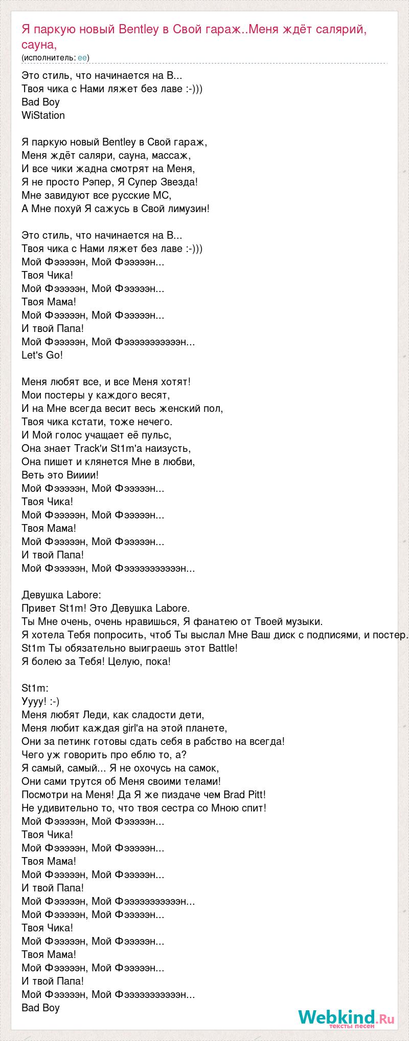 Это стиль, что начинается на В... Твоя чика с Нами ляжет без лаве :-))) Bad Boy WiStation Я паркую новый Bentley в Свой гараж, Меня ждёт саляри, сауна, массаж, И все чики жадна смотрят на Меня, Я не просто Рэпер, Я Супер Звезда! Мне завидуют все русские MC, А Мне похуй Я сажусь в Свой лимузин! Это стиль, что начинается на В... Твоя чика с Нами ляжет без лаве :-))) Мой Фэээээн, Мой Фэээээн... Твоя Чика! Мой Фэээээн, Мой Фэээээн... Твоя Мама! Мой Фэээээн, Мой Фэээээн... И твой Папа! Мой Фэээээн, Мой Фэээээээээээн... Let's Go! Меня любят все, и все Меня хотят! Мои постеры у каждого весят, И на Мне всегда весит весь женский пол, Твоя чика кстати, тоже нечего. И Мой голос учащает её пульс, Она знает Track'и St1m'a наизусть, Она пишет и клянется Мне в любви, Веть это Вииии! Мой Фэээээн, Мой Фэээээн... Твоя Чика! Мой Фэээээн, Мой Фэээээн... Твоя Мама! Мой Фэээээн, Мой Фэээээн... И твой Папа! Мой Фэээээн, Мой Фэээээээээээн... Девушка Labore: Привет St1m! Это Девушка Labore. Ты Мне очень, очень нравишься, Я фанатею от Твоей музыки. Я хотела Тебя попросить, чтоб Ты выслал Мне Ваш диск с подписями, и постер. St1m Ты обязательно выиграешь этот Battle! Я болею за Тебя! Целую, пока! St1m: Уууу! :-) Меня любят Леди, как сладости дети, Меня любит каждая girl'a на этой планете, Они за петинк готовы сдать себя в рабство на всегда! Чего уж говорить про еблю то, а? Я самый, самый... Я не охочусь на самок, Они сами трутся об Меня своими телами! Посмотри на Меня! Да Я же пиздаче чем Brad Pitt! Не удивительно то, что твоя сестра со Мною спит! Мой Фэээээн, Мой Фэээээн... Твоя Чика! Мой Фэээээн, Мой Фэээээн... Твоя Мама! Мой Фэээээн, Мой Фэээээн... И твой Папа! Мой Фэээээн, Мой Фэээээээээээн... Мой Фэээээн, Мой Фэээээн... Твоя Чика! Мой Фэээээн, Мой Фэээээн... Твоя Мама! Мой Фэээээн, Мой Фэээээн... И твой Папа! Мой Фэээээн, Мой Фэээээээээээн... Bad Boy
