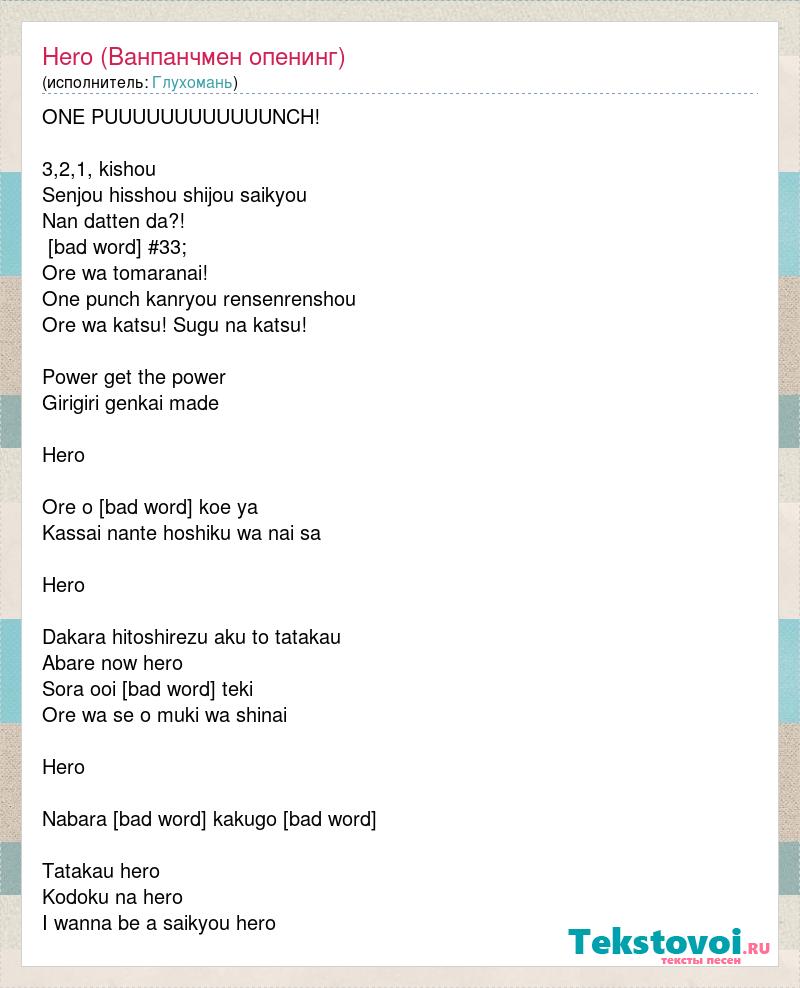 ONE PUUUUUUUUUUUUNCH! 3,2,1, kishou Senjou hisshou shijou saikyou Nan datten da?! [bad word] #33; Ore wa tomaranai! One punch kanryou rensenrenshou Ore wa katsu! Sugu na katsu! Power get the power Girigiri genkai made Hero Ore o [bad word] koe ya Kassai nante hoshiku wa nai sa Hero Dakara hitoshirezu aku to tatakau Abare now hero Sora ooi [bad word] teki Ore wa se o muki wa shinai Hero Nabara [bad word] kakugo [bad word] Tatakau hero Kodoku na hero I wanna be a saikyou hero