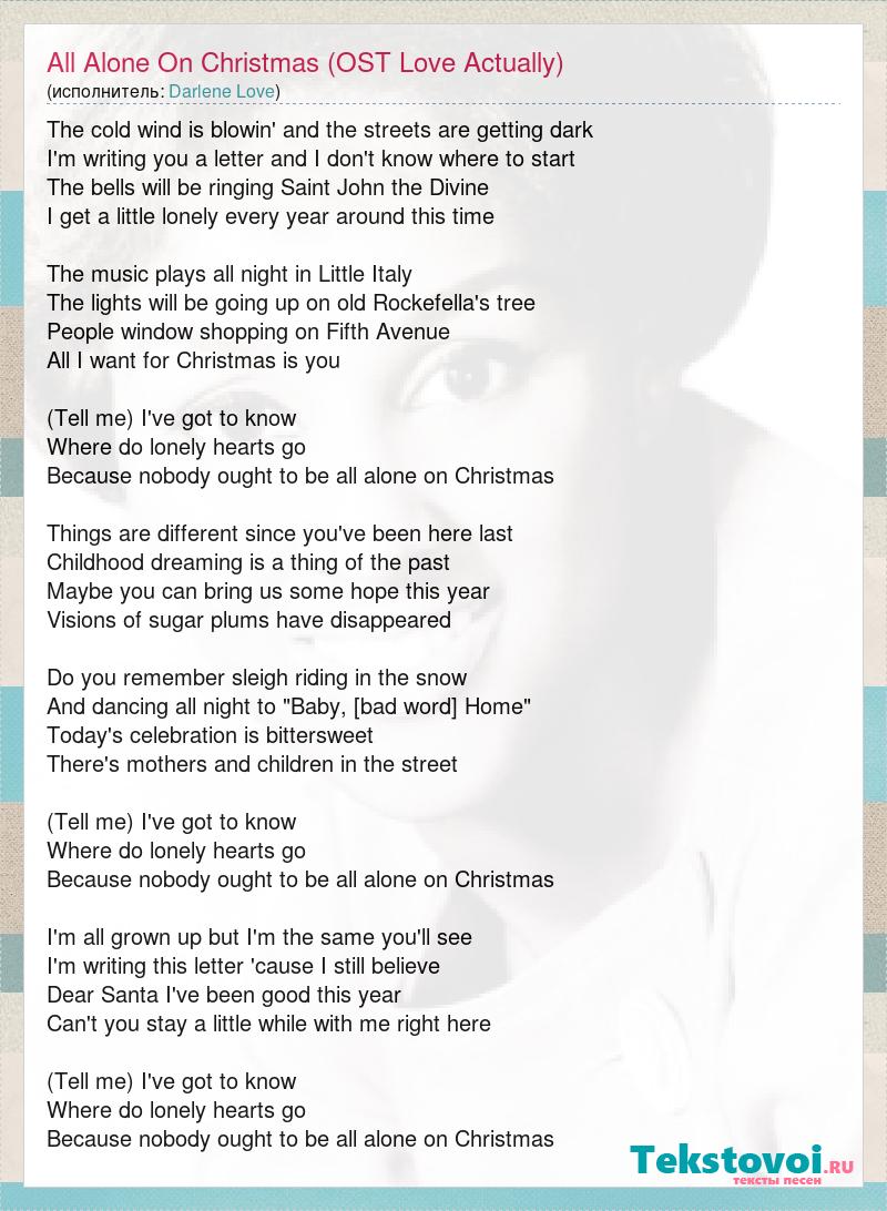 The cold wind is blowin' and the streets are getting dark I'm writing you a letter and I don't know where to start The bells will be ringing Saint John the Divine I get a little lonely every year around this time The music plays all night in Little Italy The lights will be going up on old Rockefella's tree People window shopping on Fifth Avenue All I want for Christmas is you (Tell me) I've got to know Where do lonely hearts go Because nobody ought to be all alone on Christmas Things are different since you've been here last Childhood dreaming is a thing of the past Maybe you can bring us some hope this year Visions of sugar plums have disappeared Do you remember sleigh riding in the snow And dancing all night to "Baby, [bad word] Home" Today's celebration is bittersweet There's mothers and children in the street (Tell me) I've got to know Where do lonely hearts go Because nobody ought to be all alone on Christmas I'm all grown up but I'm the same you'll see I'm writing this letter 'cause I still believe Dear Santa I've been good this year Can't you stay a little while with me right here (Tell me) I've got to know Where do lonely hearts go Because nobody ought to be all alone on Christmas