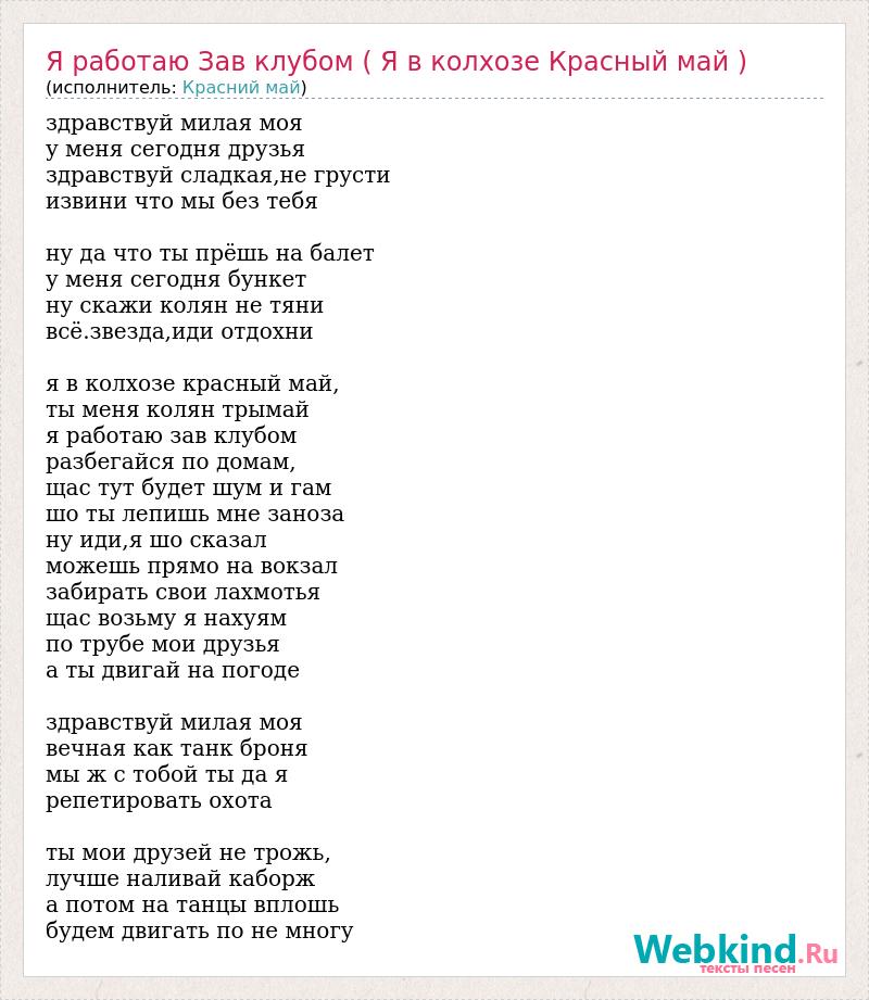 А как ты думаешь, о чем песня "Я работаю Зав клубом ( Я в колхозе Красный май )" ?