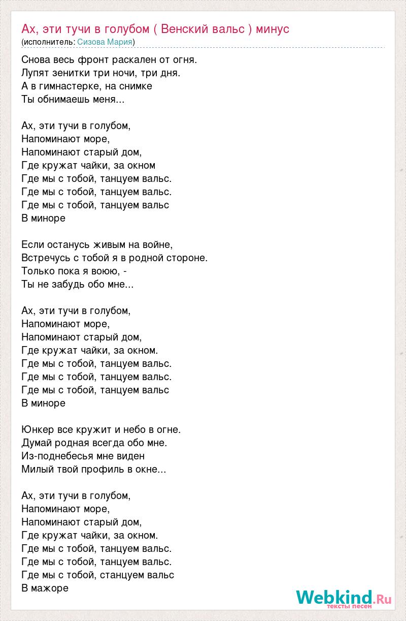 Снова весь фронт раскален от огня. Лупят зенитки три ночи, три дня. А в гимнастерке, на снимке Ты обнимаешь меня... Ах, эти тучи в голубом, Напоминают море, Напоминают старый дом, Где кружат чайки, за окном Где мы с тобой, танцуем вальс. Где мы с тобой, танцуем вальс. Где мы с тобой, танцуем вальс В миноре Если останусь живым на войне, Встречусь с тобой я в родной стороне. Только пока я воюю, - Ты не забудь обо мне... Ах, эти тучи в голубом, Напоминают море, Напоминают старый дом, Где кружат чайки, за окном. Где мы с тобой, танцуем вальс. Где мы с тобой, танцуем вальс. Где мы с тобой, танцуем вальс В миноре Юнкер все кружит и небо в огне. Думай родная всегда обо мне. Из-поднебесья мне виден Милый твой профиль в окне... Ах, эти тучи в голубом, Напоминают море, Напоминают старый дом, Где кружат чайки, за окном. Где мы с тобой, танцуем вальс. Где мы с тобой, танцуем вальс. Где мы с тобой, станцуем вальс В мажоре