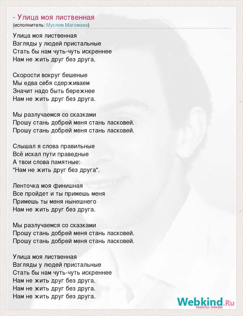 Улица моя лиственная Взгляды у людей пристальные Стать бы нам чуть-чуть искреннее Нам не жить друг без друга. Скорости вокруг бешеные Мы едва себя сдерживаем Значит надо быть бережнее Нам не жить друг без друга. Мы разлучаемся со сказками Прошу стань добрей меня стань ласковей. Прошу стань добрей меня стань ласковей. Слышал я слова правильные Всё искал пути праведные А твои слова памятные: "Нам не жить друг без друга". Ленточка моя финишная Все пройдет и ты примешь меня Примешь ты меня нынешнего Нам не жить друг без друга. Мы разлучаемся со сказками Прошу стань добрей меня стань ласковей. Прошу стань добрей меня стань ласковей. Улица моя лиственная Взгляды у людей пристальные Стать бы нам чуть-чуть искреннее Нам не жить друг без друга. Нам не жить друг без друга. Нам не жить друг без друга.