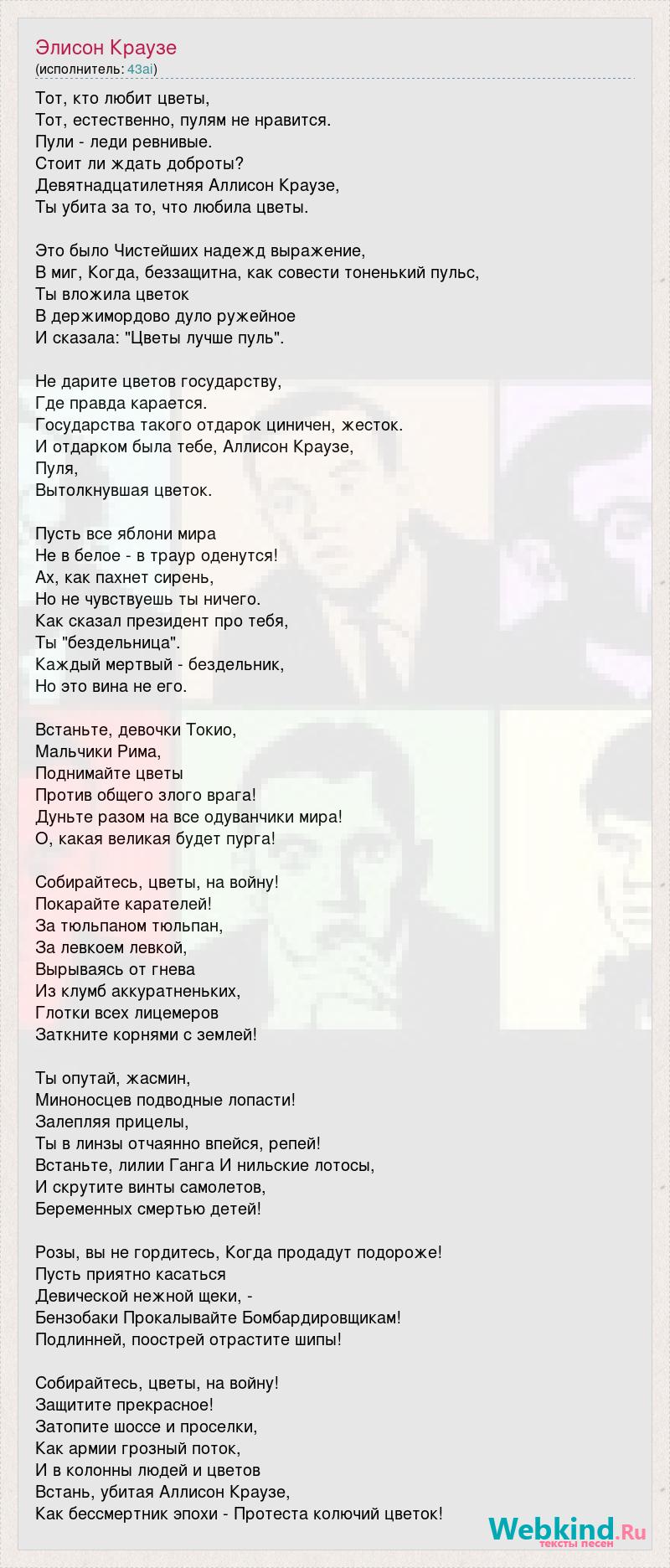 Тот, кто любит цветы, Тот, естественно, пулям не нравится. Пули - леди ревнивые. Стоит ли ждать доброты? Девятнадцатилетняя Аллисон Краузе, Ты убита за то, что любила цветы. Это было Чистейших надежд выражение, В миг, Когда, беззащитна, как совести тоненький пульс, Ты вложила цветок В держимордово дуло ружейное И сказала: "Цветы лучше пуль". Не дарите цветов государству, Где правда карается. Государства такого отдарок циничен, жесток. И отдарком была тебе, Аллисон Краузе, Пуля, Вытолкнувшая цветок. Пусть все яблони мира Не в белое - в траур оденутся! Ах, как пахнет сирень, Но не чувствуешь ты ничего. Как сказал президент про тебя, Ты "бездельница". Каждый мертвый - бездельник, Но это вина не его. Встаньте, девочки Токио, Мальчики Рима, Поднимайте цветы Против общего злого врага! Дуньте разом на все одуванчики мира! О, какая великая будет пурга! Собирайтесь, цветы, на войну! Покарайте карателей! За тюльпаном тюльпан, За левкоем левкой, Вырываясь от гнева Из клумб аккуратненьких, Глотки всех лицемеров Заткните корнями с землей! Ты опутай, жасмин, Миноносцев подводные лопасти! Залепляя прицелы, Ты в линзы отчаянно впейся, репей! Встаньте, лилии Ганга И нильские лотосы, И скрутите винты самолетов, Беременных смертью детей! Розы, вы не гордитесь, Когда продадут подороже! Пусть приятно касаться Девической нежной щеки, - Бензобаки Прокалывайте Бомбардировщикам! Подлинней, поострей отрастите шипы! Собирайтесь, цветы, на войну! Защитите прекрасное! Затопите шоссе и проселки, Как армии грозный поток, И в колонны людей и цветов Встань, убитая Аллисон Краузе, Как бессмертник эпохи - Протеста колючий цветок!