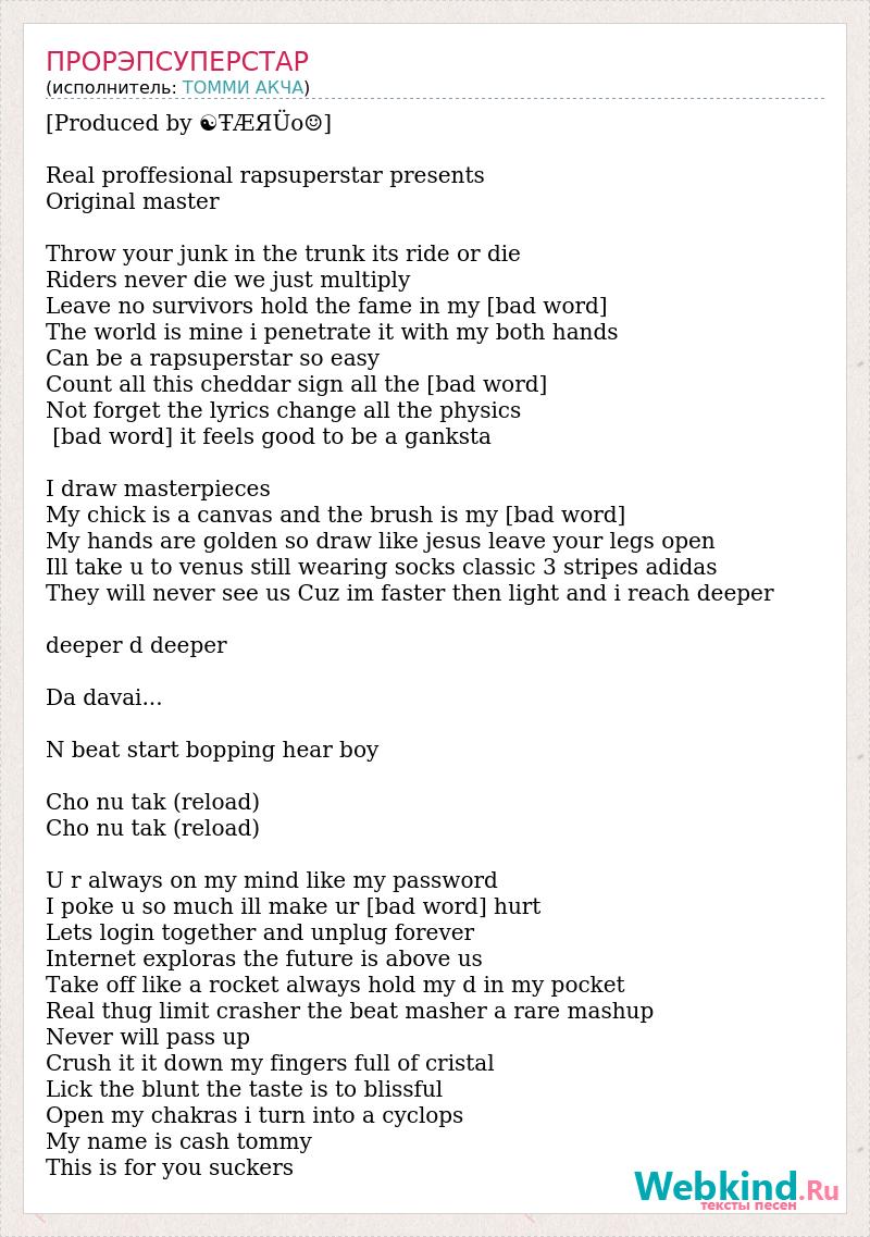 [Produced by ☯ŦÆЯÜ汰ムo☺] Real proffesional rapsuperstar presents Original master Throw your junk in the trunk its ride or die Riders never die we just multiply Leave no survivors hold the fame in my [bad word] The world is mine i penetrate it with my both hands Can be a rapsuperstar so easy Count all this cheddar sign all the [bad word] Not forget the lyrics change all the physics [bad word] it feels good to be a ganksta I draw masterpieces My chick is a canvas and the brush is my [bad word] My hands are golden so draw like jesus leave your legs open Ill take u to venus still wearing socks classic 3 stripes adidas They will never see us Cuz im faster then light and i reach deeper deeper d deeper Da davai... N beat start bopping hear boy Cho nu tak (reload) Cho nu tak (reload) U r always on my mind like my password I poke u so much ill make ur [bad word] hurt Lets login together and unplug forever Internet exploras the future is above us Take off like a rocket always hold my d in my pocket Real thug limit crasher the beat masher a rare mashup Never will pass up Crush it it down my fingers full of cristal Lick the blunt the taste is to blissful Open my chakras i turn into a cyclops My name is cash tommy This is for you suckers