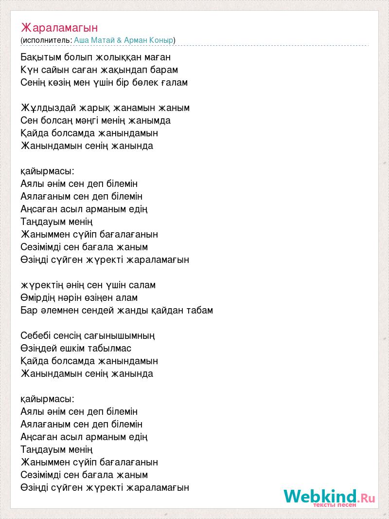 Бақытым болып жолыққан маған Күн сайын саған жақындап барам Сенің көзің мен үшін бір бөлек ғалам Жұлдыздай жарық жанамын жаным Сен болсаң мәңгі менің жанымда Қайда болсамда жанындамын Жанындамын сенің жанында қайырмасы: Аялы әнім сен деп білемін Аялағаным сен деп білемін Аңсаған асыл арманым едің Таңдауым менің Жаныммен сүйіп бағалағанын Сезімімді сен бағала жаным Өзіңді сүйген жүректі жараламағын жүректің әнің сен үшін салам Өмірдің нәрін өзіңен алам Бар әлемнен сендей жанды қайдан табам Себебі сенсің сағынышымның Өзіңдей ешкім табылмас Қайда болсамда жанындамын Жанындамын сенің жанында қайырмасы: Аялы әнім сен деп білемін Аялағаным сен деп білемін Аңсаған асыл арманым едің Таңдауым менің Жаныммен сүйіп бағалағанын Сезімімді сен бағала жаным Өзіңді сүйген жүректі жараламағын