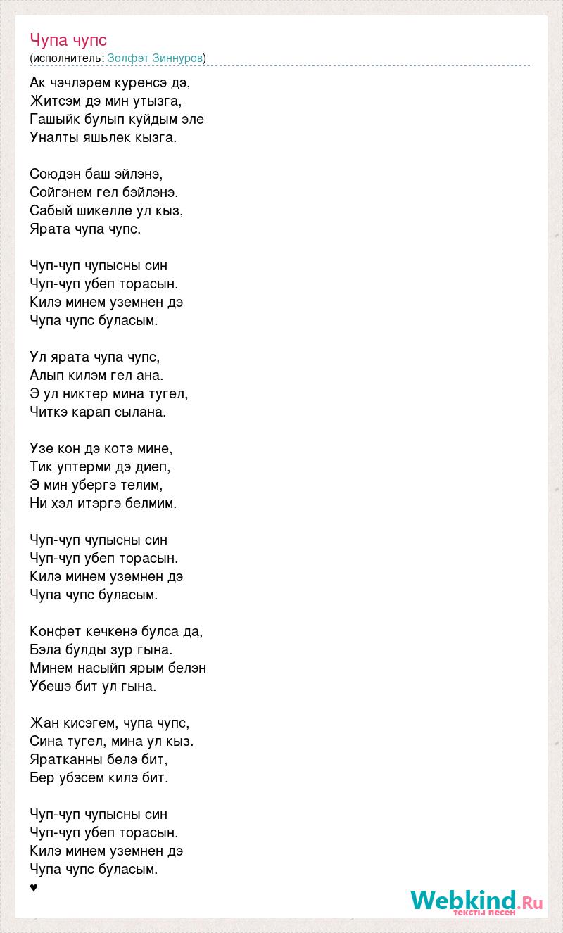 Ак чэчлэрем куренсэ дэ, Житсэм дэ мин утызга, Гашыйк булып куйдым эле Уналты яшьлек кызга. Союдэн баш эйлэнэ, Сойгэнем гел бэйлэнэ. Сабый шикелле ул кыз, Ярата чупа чупс. Чуп-чуп чупысны син Чуп-чуп убеп торасын. Килэ минем уземнен дэ Чупа чупс буласым. Ул ярата чупа чупс, Алып килэм гел ана. Э ул никтер мина тугел, Читкэ карап сылана. Узе кон дэ котэ мине, Тик уптерми дэ диеп, Э мин убергэ телим, Ни хэл итэргэ белмим. Чуп-чуп чупысны син Чуп-чуп убеп торасын. Килэ минем уземнен дэ Чупа чупс буласым. Конфет кечкенэ булса да, Бэла булды зур гына. Минем насыйп ярым белэн Убешэ бит ул гына. Жан кисэгем, чупа чупс, Сина тугел, мина ул кыз. Яратканны белэ бит, Бер убэсем килэ бит. Чуп-чуп чупысны син Чуп-чуп убеп торасын. Килэ минем уземнен дэ Чупа чупс буласым. ♥