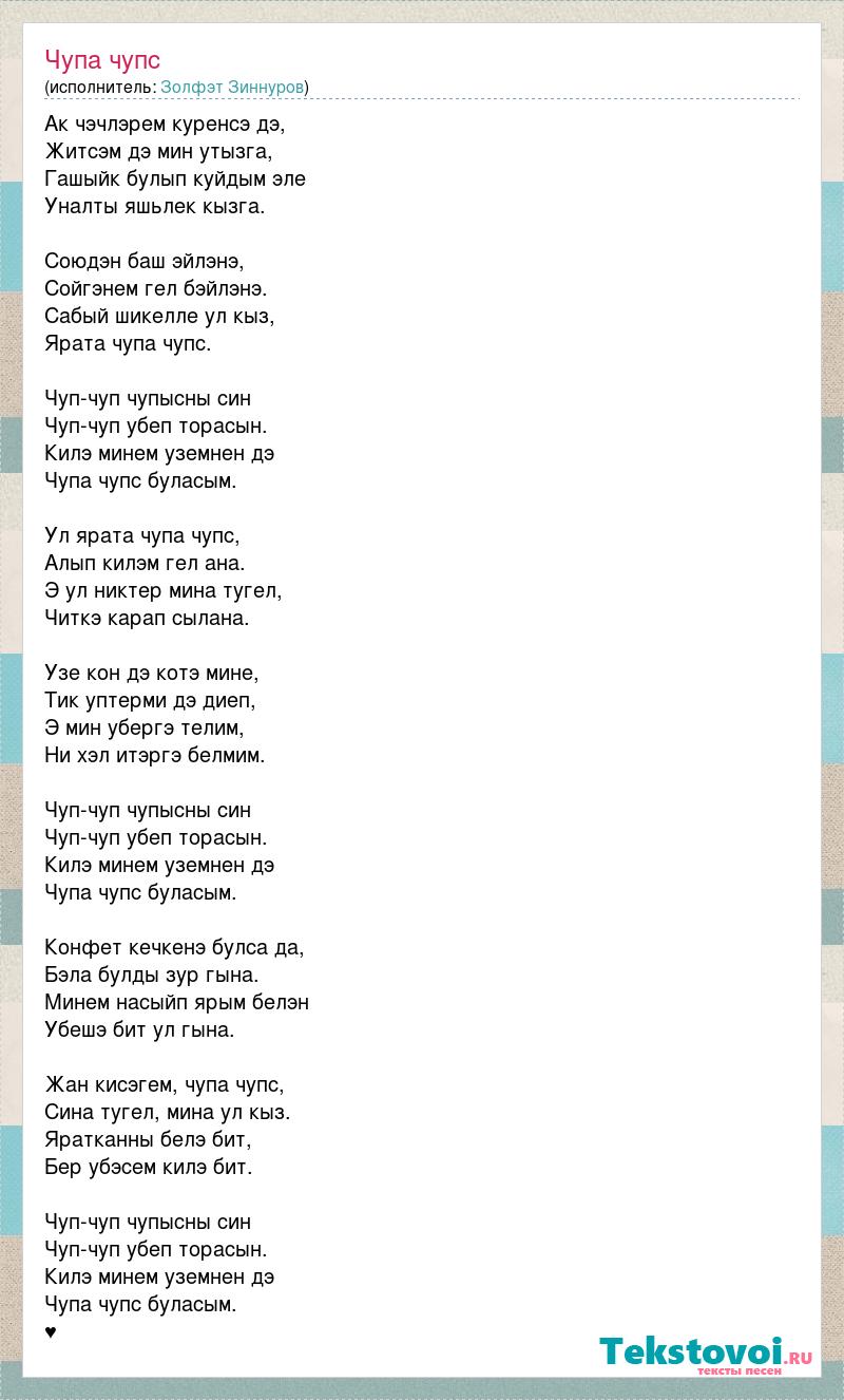 Ак чэчлэрем куренсэ дэ, Житсэм дэ мин утызга, Гашыйк булып куйдым эле Уналты яшьлек кызга. Союдэн баш эйлэнэ, Сойгэнем гел бэйлэнэ. Сабый шикелле ул кыз, Ярата чупа чупс. Чуп-чуп чупысны син Чуп-чуп убеп торасын. Килэ минем уземнен дэ Чупа чупс буласым. Ул ярата чупа чупс, Алып килэм гел ана. Э ул никтер мина тугел, Читкэ карап сылана. Узе кон дэ котэ мине, Тик уптерми дэ диеп, Э мин убергэ телим, Ни хэл итэргэ белмим. Чуп-чуп чупысны син Чуп-чуп убеп торасын. Килэ минем уземнен дэ Чупа чупс буласым. Конфет кечкенэ булса да, Бэла булды зур гына. Минем насыйп ярым белэн Убешэ бит ул гына. Жан кисэгем, чупа чупс, Сина тугел, мина ул кыз. Яратканны белэ бит, Бер убэсем килэ бит. Чуп-чуп чупысны син Чуп-чуп убеп торасын. Килэ минем уземнен дэ Чупа чупс буласым. ♥
