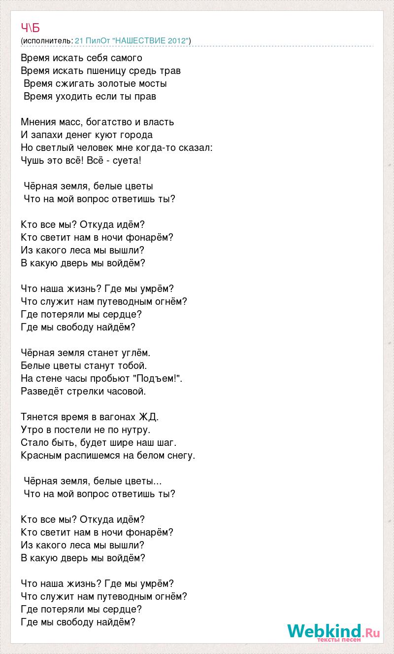 Время искать себя самого Время искать пшеницу средь трав Время сжигать золотые мосты Время уходить если ты прав Мнения масс, богатство и власть И запахи денег куют города Но светлый человек мне когда-то сказал: Чушь это всё! Всё - суета! Чёрная земля, белые цветы Что на мой вопрос ответишь ты? Кто все мы? Откуда идём? Кто светит нам в ночи фонарём? Из какого леса мы вышли? В какую дверь мы войдём? Что наша жизнь? Где мы умрём? Что служит нам путеводным огнём? Где потеряли мы сердце? Где мы свободу найдём? Чёрная земля станет углём. Белые цветы станут тобой. На стене часы пробьют "Подъем!". Разведёт стрелки часовой. Тянется время в вагонах ЖД. Утро в постели не по нутру. Стало быть, будет шире наш шаг. Красным распишемся на белом снегу. Чёрная земля, белые цветы... Что на мой вопрос ответишь ты? Кто все мы? Откуда идём? Кто светит нам в ночи фонарём? Из какого леса мы вышли? В какую дверь мы войдём? Что наша жизнь? Где мы умрём? Что служит нам путеводным огнём? Где потеряли мы сердце? Где мы свободу найдём?