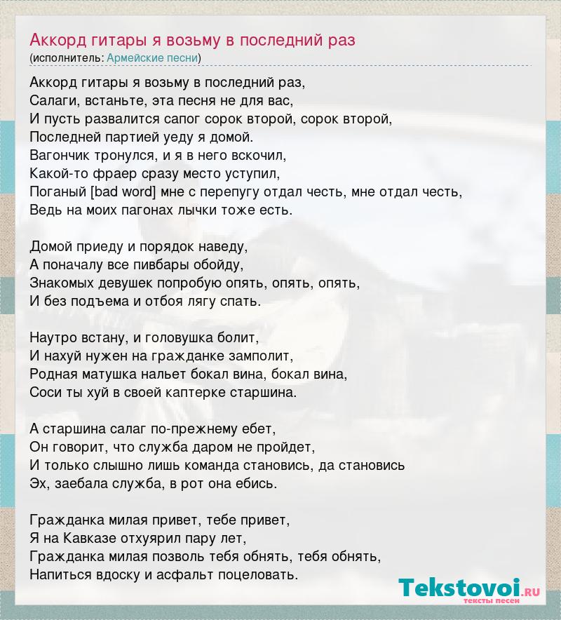 Аккорд гитары я возьму в последний раз, Салаги, встаньте, эта песня не для вас, И пусть развалится сапог сорок второй, сорок второй, Последней партией уеду я домой. Вагончик тронулся, и я в него вскочил, Какой-то фраер сразу место уступил, Поганый [bad word] мне с перепугу отдал честь, мне отдал честь, Ведь на моих пагонах лычки тоже есть. Домой приеду и порядок наведу, А поначалу все пивбары обойду, Знакомых девушек попробую опять, опять, опять, И без подъема и отбоя лягу спать. Наутро встану, и головушка болит, И нахуй нужен на гражданке замполит, Родная матушка нальет бокал вина, бокал вина, Соси ты хуй в своей каптерке старшина. А старшина салаг по-прежнему ебет, Он говорит, что служба даром не пройдет, И только слышно лишь команда становись, да становись Эх, заебала служба, в рот она ебись. Гражданка милая привет, тебе привет, Я на Кавказе отхуярил пару лет, Гражданка милая позволь тебя обнять, тебя обнять, Напиться вдоску и асфальт поцеловать.