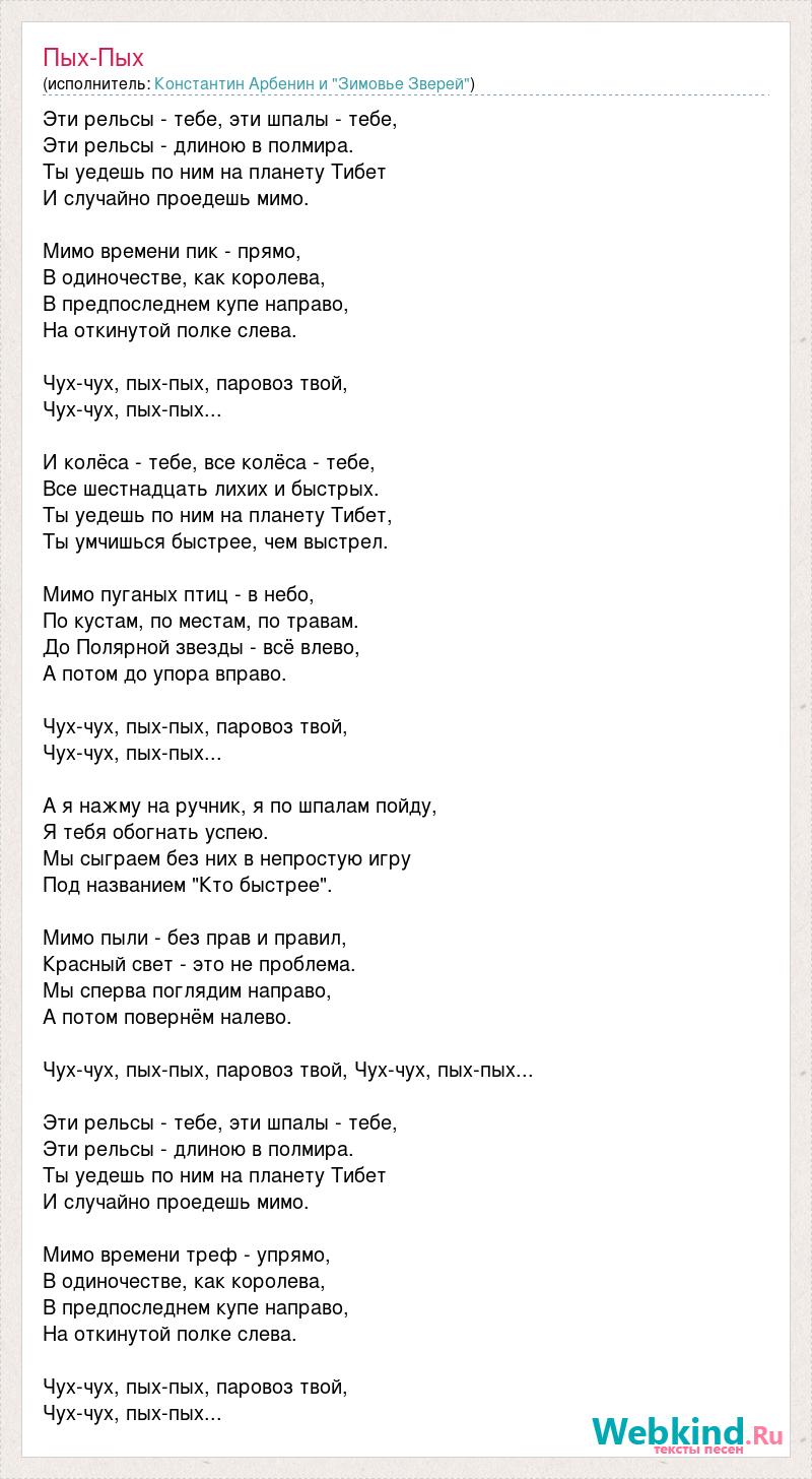 Эти рельсы - тебе, эти шпалы - тебе, Эти рельсы - длиною в полмира. Ты уедешь по ним на планету Тибет И случайно проедешь мимо. Мимо времени пик - прямо, В одиночестве, как королева, В предпоследнем купе направо, На откинутой полке слева. Чух-чух, пых-пых, паровоз твой, Чух-чух, пых-пых... И колёса - тебе, все колёса - тебе, Все шестнадцать лихих и быстрых. Ты уедешь по ним на планету Тибет, Ты умчишься быстрее, чем выстрел. Мимо пуганых птиц - в небо, По кустам, по местам, по травам. До Полярной звезды - всё влево, А потом до упора вправо. Чух-чух, пых-пых, паровоз твой, Чух-чух, пых-пых... А я нажму на ручник, я по шпалам пойду, Я тебя обогнать успею. Мы сыграем без них в непростую игру Под названием "Кто быстрее". Мимо пыли - без прав и правил, Красный свет - это не проблема. Мы сперва поглядим направо, А потом повернём налево. Чух-чух, пых-пых, паровоз твой, Чух-чух, пых-пых... Эти рельсы - тебе, эти шпалы - тебе, Эти рельсы - длиною в полмира. Ты уедешь по ним на планету Тибет И случайно проедешь мимо. Мимо времени треф - упрямо, В одиночестве, как королева, В предпоследнем купе направо, На откинутой полке слева. Чух-чух, пых-пых, паровоз твой, Чух-чух, пых-пых...