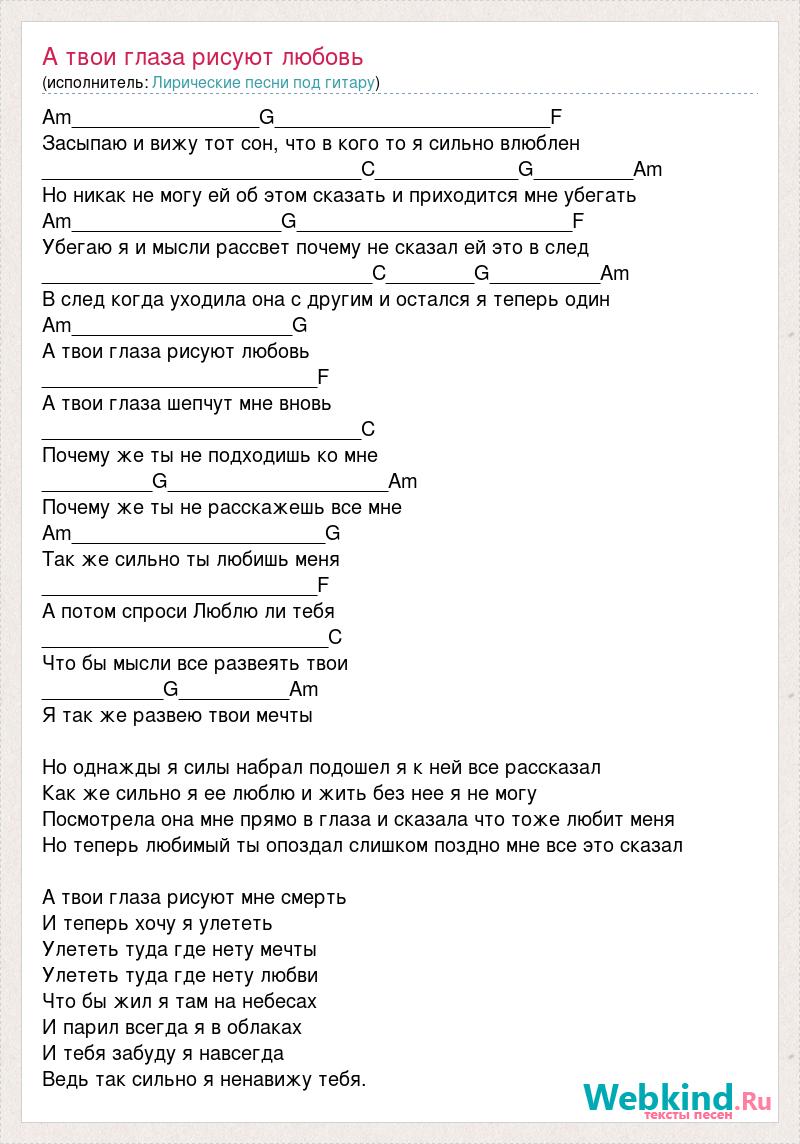 Am_________________G_________________________F Засыпаю и вижу тот сон, что в кого то я сильно влюблен _____________________________C_____________G_________Am Но никак не могу ей об этом сказать и приходится мне убегать Am___________________G_________________________F Убегаю я и мысли рассвет почему не сказал ей это в след ______________________________C________G__________Am В след когда уходила она с другим и остался я теперь один Am____________________G А твои глаза рисуют любовь _________________________F А твои глаза шепчут мне вновь _____________________________C Почему же ты не подходишь ко мне __________G____________________Am Почему же ты не расскажешь все мне Am_______________________G Так же сильно ты любишь меня _________________________F А потом спроси Люблю ли тебя __________________________C Что бы мысли все развеять твои ___________G__________Am Я так же развею твои мечты Но однажды я силы набрал подошел я к ней все рассказал Как же сильно я ее люблю и жить без нее я не могу Посмотрела она мне прямо в глаза и сказала что тоже любит меня Но теперь любимый ты опоздал слишком поздно мне все это сказал А твои глаза рисуют мне смерть И теперь хочу я улететь Улететь туда где нету мечты Улететь туда где нету любви Что бы жил я там на небесах И парил всегда я в облаках И тебя забуду я навсегда Ведь так сильно я ненавижу тебя.