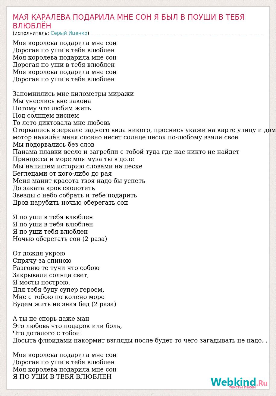 Моя королева подарила мне сон Дорогая по уши в тебя влюблен Моя королева подарила мне сон Дорогая по уши в тебя влюблен Моя королева подарила мне сон Дорогая по уши в тебя влюблен Запомнились мне километры миражи Мы унеслись вне закона Потому что любим жить Под солнцем виснем То лето диктовала мне любовь Оторвались в зеркале заднего вида никого, проснись укажи на карте улицу и дом мотор накалён меня словно несет солнце песок по-любому взяли свое Мы подорвались без слов Панама плавки весло и загребли с тобой туда где нас никто не найдет Принцесса и море моя муза ты в доле Мы напишем историю словами на песке Беглецами от кого-либо до рая Меня манит красота твоя надо бы успеть До заката кров сколотить Звезды с небо собрать и тебе подарить Дров нарубить ночью оберегать сон Я по уши в тебя влюблен Я по уши в тебя влюблен Я по уши тебя влюблен Ночью оберегать сон (2 раза) От дождя укрою Спрячу за спиною Разгоню те тучи что собою Закрывали солнца свет, Я мосты построю, Для тебя буду супер героем, Мне с тобою по колено море Будем жить не зная бед (2 раза) А ты не спорь даже ман Это любовь что подарок или боль, Что доталого с тобой Досыта флюидами накормит взгляды после будет то чего загадывать не надо. . Моя королева подарила мне сон Дорогая по уши в тебя влюблен Моя королева подарила мне сон Я ПО УШИ В ТЕБЯ ВЛЮБЛЕН