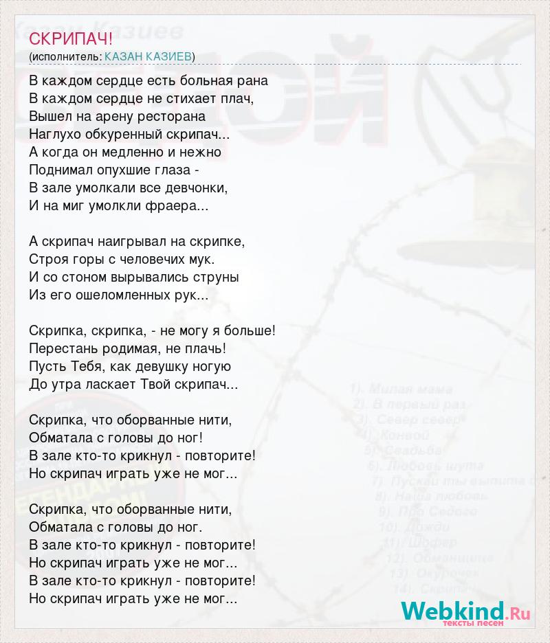 В каждом сердце есть больная рана В каждом сердце не стихает плач, Вышел на арену ресторана Наглухо обкуренный скрипач... А когда он медленно и нежно Поднимал опухшие глаза - В зале умолкали все девчонки, И на миг умолкли фраера... А скрипач наигрывал на скрипке, Строя горы с человечих мук. И со стоном вырывались струны Из его ошеломленных рук... Скрипка, скрипка, - не могу я больше! Перестань родимая, не плачь! Пусть Тебя, как девушку ногую До утра ласкает Твой скрипач... Скрипка, что оборванные нити, Обматала с головы до ног! В зале кто-то крикнул - повторите! Но скрипач играть уже не мог... Скрипка, что оборванные нити, Обматала с головы до ног. В зале кто-то крикнул - повторите! Но скрипач играть уже не мог... В зале кто-то крикнул - повторите! Но скрипач играть уже не мог...