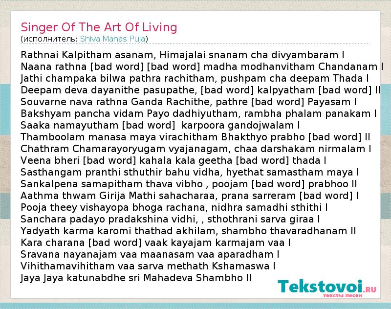 Rathnai Kalpitham asanam, Himajalai snanam cha divyambaram l Naana rathna [bad word] [bad word] madha modhanvitham Chandanam l Jathi champaka bilwa pathra rachitham, pushpam cha deepam Thada l Deepam deva dayanithe pasupathe, [bad word] kalpyatham [bad word] ll Souvarne nava rathna Ganda Rachithe, pathre [bad word] Payasam l Bakshyam pancha vidam Payo dadhiyutham, rambha phalam panakam l Saaka namayutham [bad word] karpoora gandojwalam l Thamboolam manasa maya virachitham Bhakthyo prabho [bad word] ll Chathram Chamarayoryugam vyajanagam, chaa darshakam nirmalam l Veena bheri [bad word] kahala kala geetha [bad word] thada l Sasthangam pranthi sthuthir bahu vidha, hyethat samastham maya l Sankalpena samapitham thava vibho , poojam [bad word] prabhoo ll Aathma thwam Girija Mathi sahacharaa, prana sarreram [bad word] l Pooja theey vishayopa bhoga rachana, nidhra samadhi sthithi l Sanchara padayo pradakshina vidhi, , sthothrani sarva giraa l Yadyath karma karomi thathad akhilam, shambho thavaradhanam ll Kara charana [bad word] vaak kayajam karmajam vaa l Sravana nayanajam vaa maanasam vaa aparadham l Vihithamavihitham vaa sarva methath Kshamaswa l Jaya Jaya katunabdhe sri Mahadeva Shambho ll