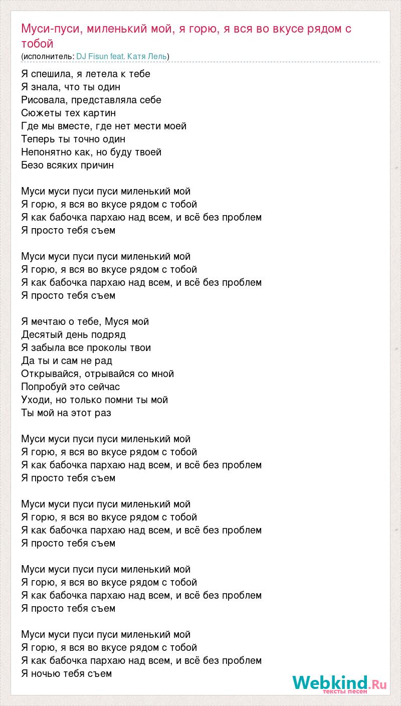 Я спешила, я летела к тебе Я знала, что ты один Рисовала, представляла себе Сюжеты тех картин Где мы вместе, где нет мести моей Теперь ты точно один Непонятно как, но буду твоей Безо всяких причин Муси муси пуси пуси миленький мой Я горю, я вся во вкусе рядом с тобой Я как бабочка пархаю над всем, и всё без проблем Я просто тебя съем Муси муси пуси пуси миленький мой Я горю, я вся во вкусе рядом с тобой Я как бабочка пархаю над всем, и всё без проблем Я просто тебя съем Я мечтаю о тебе, Муся мой Десятый день подряд Я забыла все проколы твои Да ты и сам не рад Открывайся, отрывайся со мной Попробуй это сейчас Уходи, но только помни ты мой Ты мой на этот раз Муси муси пуси пуси миленький мой Я горю, я вся во вкусе рядом с тобой Я как бабочка пархаю над всем, и всё без проблем Я просто тебя съем Муси муси пуси пуси миленький мой Я горю, я вся во вкусе рядом с тобой Я как бабочка пархаю над всем, и всё без проблем Я просто тебя съем Муси муси пуси пуси миленький мой Я горю, я вся во вкусе рядом с тобой Я как бабочка пархаю над всем, и всё без проблем Я просто тебя съем Муси муси пуси пуси миленький мой Я горю, я вся во вкусе рядом с тобой Я как бабочка пархаю над всем, и всё без проблем Я ночью тебя съем