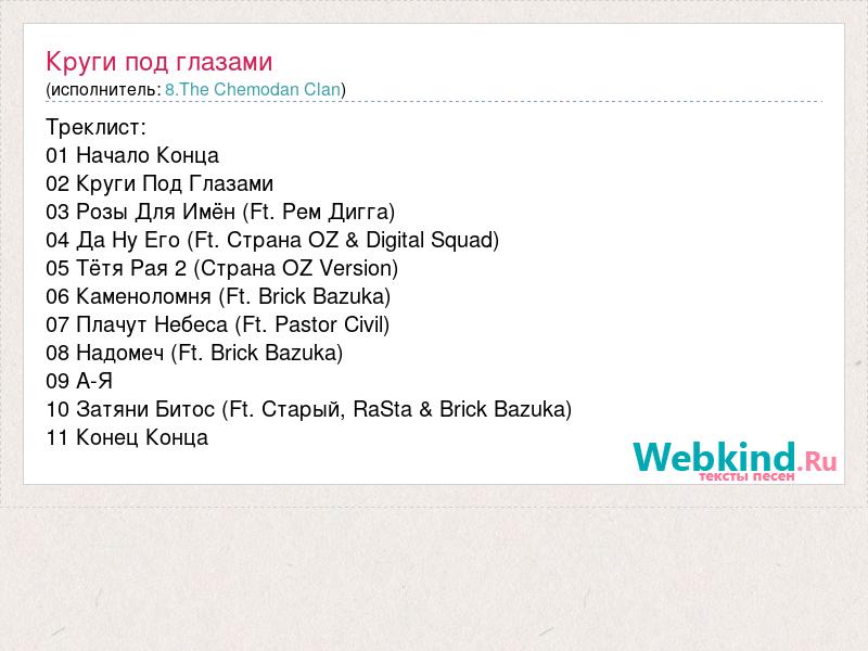 Треклист: 01 Начало Конца 02 Круги Под Глазами 03 Розы Для Имён (Ft. Рем Дигга) 04 Да Ну Его (Ft. Страна OZ & Digital Squad) 05 Тётя Рая 2 (Страна OZ Version) 06 Каменоломня (Ft. Brick Bazuka) 07 Плачут Небеса (Ft. Pastor Civil) 08 Надомеч (Ft. Brick Bazuka) 09 А-Я 10 Затяни Битос (Ft. Старый, RaSta & Brick Bazuka) 11 Конец Конца
