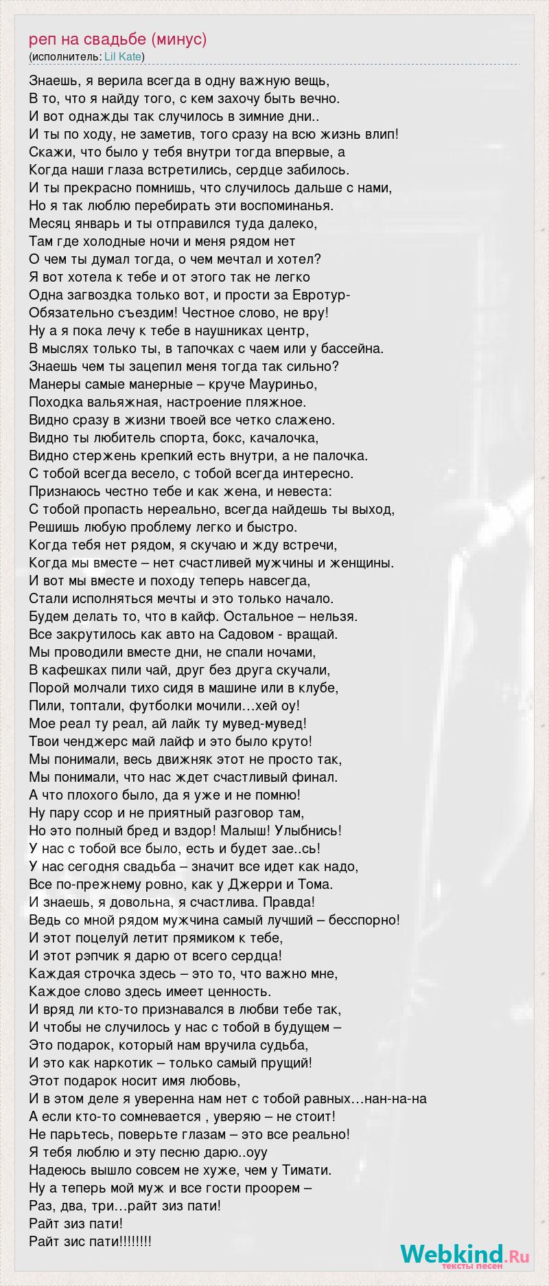 Знаешь, я верила всегда в одну важную вещь, В то, что я найду того, с кем захочу быть вечно. И вот однажды так случилось в зимние дни.. И ты по ходу, не заметив, того сразу на всю жизнь влип! Скажи, что было у тебя внутри тогда впервые, а Когда наши глаза встретились, сердце забилось. И ты прекрасно помнишь, что случилось дальше с нами, Но я так люблю перебирать эти воспоминанья. Месяц январь и ты отправился туда далеко, Там где холодные ночи и меня рядом нет О чем ты думал тогда, о чем мечтал и хотел? Я вот хотела к тебе и от этого так не легко Одна загвоздка только вот, и прости за Евротур- Обязательно съездим! Честное слово, не вру! Ну а я пока лечу к тебе в наушниках центр, В мыслях только ты, в тапочках с чаем или у бассейна. Знаешь чем ты зацепил меня тогда так сильно? Манеры самые манерные – круче Мауриньо, Походка вальяжная, настроение пляжное. Видно сразу в жизни твоей все четко слажено. Видно ты любитель спорта, бокс, качалочка, Видно стержень крепкий есть внутри, а не палочка. С тобой всегда весело, с тобой всегда интересно. Признаюсь честно тебе и как жена, и невеста: С тобой пропасть нереально, всегда найдешь ты выход, Решишь любую проблему легко и быстро. Когда тебя нет рядом, я скучаю и жду встречи, Когда мы вместе – нет счастливей мужчины и женщины. И вот мы вместе и походу теперь навсегда, Стали исполняться мечты и это только начало. Будем делать то, что в кайф. Остальное – нельзя. Все закрутилось как авто на Садовом - вращай. Мы проводили вместе дни, не спали ночами, В кафешках пили чай, друг без друга скучали, Порой молчали тихо сидя в машине или в клубе, Пили, топтали, футболки мочили…хей оу! Мое реал ту реал, ай лайк ту мувед-мувед! Твои ченджерс май лайф и это было круто! Мы понимали, весь движняк этот не просто так, Мы понимали, что нас ждет счастливый финал. А что плохого было, да я уже и не помню! Ну пару ссор и не приятный разговор там, Но это полный бред и вздор! Малыш! Улыбнись! У нас с тобой все было, есть и будет зае..сь! У нас сегодня свадьба – значит все идет как надо, Все по-прежнему ровно, как у Джерри и Тома. И знаешь, я довольна, я счастлива. Правда! Ведь со мной рядом мужчина самый лучший – бесспорно! И этот поцелуй летит прямиком к тебе, И этот рэпчик я дарю от всего сердца! Каждая строчка здесь – это то, что важно мне, Каждое слово здесь имеет ценность. И вряд ли кто-то признавался в любви тебе так, И чтобы не случилось у нас с тобой в будущем – Это подарок, который нам вручила судьба, И это как наркотик – только самый прущий! Этот подарок носит имя любовь, И в этом деле я уверенна нам нет с тобой равных…нан-на-на А если кто-то сомневается , уверяю – не стоит! Не парьтесь, поверьте глазам – это все реально! Я тебя люблю и эту песню дарю..оуу Надеюсь вышло совсем не хуже, чем у Тимати. Ну а теперь мой муж и все гости проорем – Раз, два, три…райт зиз пати! Райт зиз пати! Райт зис пати!!!!!!!!