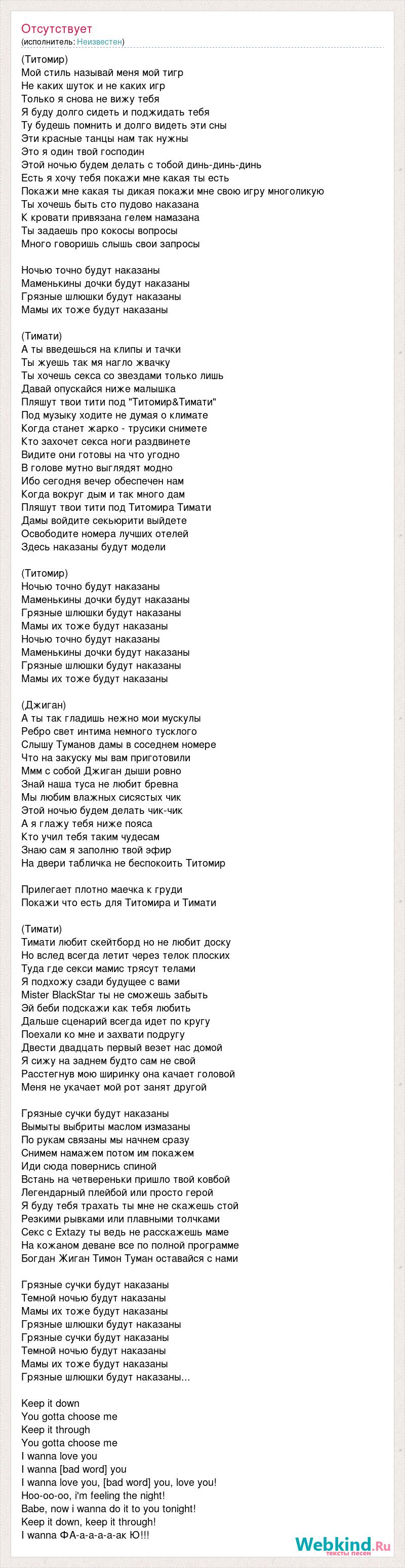 (Титомир) Мой стиль называй меня мой тигр Не каких шуток и не каких игр Только я снова не вижу тебя Я буду долго сидеть и поджидать тебя Ту будешь помнить и долго видеть эти сны Эти красные танцы нам так нужны Это я один твой господин Этой ночью будем делать с тобой динь-динь-динь Есть я хочу тебя покажи мне какая ты есть Покажи мне какая ты дикая покажи мне свою игру многоликую Ты хочешь быть сто пудово наказана К кровати привязана гелем намазана Ты задаешь про кокосы вопросы Много говоришь слышь свои запросы Ночью точно будут наказаны Маменькины дочки будут наказаны Грязные шлюшки будут наказаны Мамы их тоже будут наказаны (Тимати) А ты введешься на клипы и тачки Ты жуешь так мя нагло жвачку Ты хочешь секса со звездами только лишь Давай опускайся ниже малышка Пляшут твои тити под "Титомир&Тимати" Под музыку ходите не думая о климате Когда станет жарко - трусики снимете Кто захочет секса ноги раздвинете Видите они готовы на что угодно В голове мутно выглядят модно Ибо сегодня вечер обеспечен нам Когда вокруг дым и так много дам Пляшут твои тити под Титомира Тимати Дамы войдите секьюрити выйдете Освободите номера лучших отелей Здесь наказаны будут модели (Титомир) Ночью точно будут наказаны Маменькины дочки будут наказаны Грязные шлюшки будут наказаны Мамы их тоже будут наказаны Ночью точно будут наказаны Маменькины дочки будут наказаны Грязные шлюшки будут наказаны Мамы их тоже будут наказаны (Джиган) А ты так гладишь нежно мои мускулы Ребро свет интима немного тусклого Слышу Туманов дамы в соседнем номере Что на закуску мы вам приготовили Ммм с собой Джиган дыши ровно Знай наша туса не любит бревна Мы любим влажных сисястых чик Этой ночью будем делать чик-чик А я глажу тебя ниже пояса Кто учил тебя таким чудесам Знаю сам я заполню твой эфир На двери табличка не беспокоить Титомир Прилегает плотно маечка к груди Покажи что есть для Титомира и Тимати (Тимати) Тимати любит скейтборд но не любит доску Но вслед всегда летит через телок плоских Туда где секси мамис трясут телами Я подхожу сзади будущее с вами Mister BlackStar ты не сможешь забыть Эй беби подскажи как тебя любить Дальше сценарий всегда идет по кругу Поехали ко мне и захвати подругу Двести двадцать первый везет нас домой Я сижу на заднем будто сам не свой Расстегнув мою ширинку она качает головой Меня не укачает мой рот занят другой Грязные сучки будут наказаны Вымыты выбриты маслом измазаны По рукам связаны мы начнем сразу Снимем намажем потом им покажем Иди сюда повернись спиной Встань на четвереньки пришло твой ковбой Легендарный плейбой или просто герой Я буду тебя трахать ты мне не скажешь стой Резкими рывками или плавными толчками Секс с Extazy ты ведь не расскажешь маме На кожаном деване все по полной программе Богдан Жиган Тимон Туман оставайся с нами Грязные сучки будут наказаны Темной ночью будут наказаны Мамы их тоже будут наказаны Грязные шлюшки будут наказаны Грязные сучки будут наказаны Темной ночью будут наказаны Мамы их тоже будут наказаны Грязные шлюшки будут наказаны... Keep it down You gotta choose me Keep it through You gotta choose me I wanna love you I wanna [bad word] you I wanna love you, [bad word] you, love you! Hoo-oo-oo, i'm feeling the night! Babe, now i wanna do it to you tonight! Keep it down, keep it through! I wanna ФА-а-а-а-а-ак Ю!!!