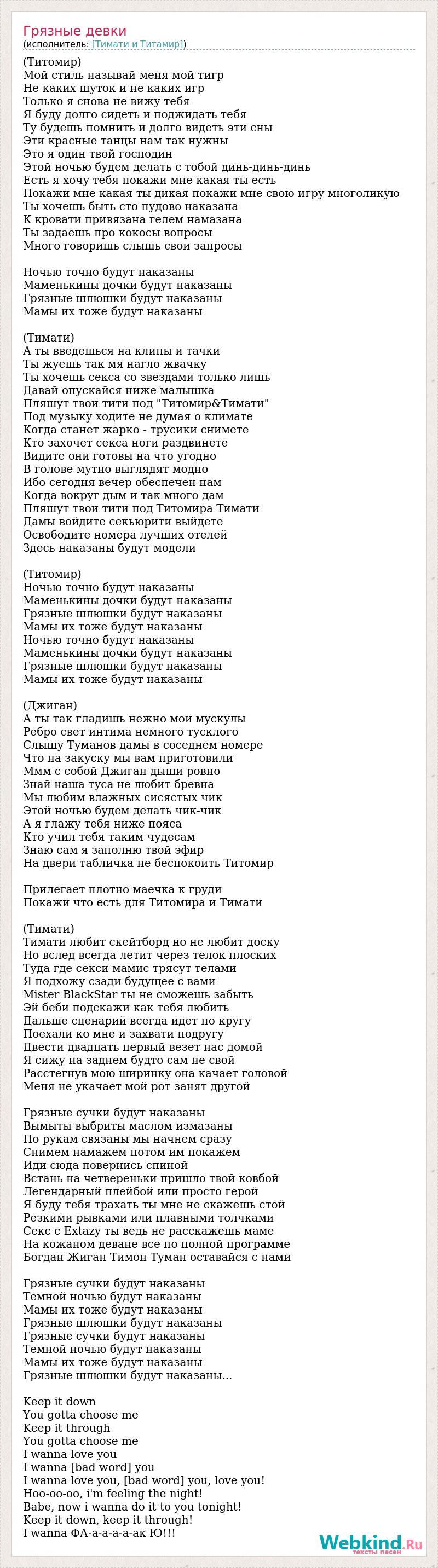 (Титомир) Мой стиль называй меня мой тигр Не каких шуток и не каких игр Только я снова не вижу тебя Я буду долго сидеть и поджидать тебя Ту будешь помнить и долго видеть эти сны Эти красные танцы нам так нужны Это я один твой господин Этой ночью будем делать с тобой динь-динь-динь Есть я хочу тебя покажи мне какая ты есть Покажи мне какая ты дикая покажи мне свою игру многоликую Ты хочешь быть сто пудово наказана К кровати привязана гелем намазана Ты задаешь про кокосы вопросы Много говоришь слышь свои запросы Ночью точно будут наказаны Маменькины дочки будут наказаны Грязные шлюшки будут наказаны Мамы их тоже будут наказаны (Тимати) А ты введешься на клипы и тачки Ты жуешь так мя нагло жвачку Ты хочешь секса со звездами только лишь Давай опускайся ниже малышка Пляшут твои тити под "Титомир&Тимати" Под музыку ходите не думая о климате Когда станет жарко - трусики снимете Кто захочет секса ноги раздвинете Видите они готовы на что угодно В голове мутно выглядят модно Ибо сегодня вечер обеспечен нам Когда вокруг дым и так много дам Пляшут твои тити под Титомира Тимати Дамы войдите секьюрити выйдете Освободите номера лучших отелей Здесь наказаны будут модели (Титомир) Ночью точно будут наказаны Маменькины дочки будут наказаны Грязные шлюшки будут наказаны Мамы их тоже будут наказаны Ночью точно будут наказаны Маменькины дочки будут наказаны Грязные шлюшки будут наказаны Мамы их тоже будут наказаны (Джиган) А ты так гладишь нежно мои мускулы Ребро свет интима немного тусклого Слышу Туманов дамы в соседнем номере Что на закуску мы вам приготовили Ммм с собой Джиган дыши ровно Знай наша туса не любит бревна Мы любим влажных сисястых чик Этой ночью будем делать чик-чик А я глажу тебя ниже пояса Кто учил тебя таким чудесам Знаю сам я заполню твой эфир На двери табличка не беспокоить Титомир Прилегает плотно маечка к груди Покажи что есть для Титомира и Тимати (Тимати) Тимати любит скейтборд но не любит доску Но вслед всегда летит через телок плоских Туда где секси мамис трясут телами Я подхожу сзади будущее с вами Mister BlackStar ты не сможешь забыть Эй беби подскажи как тебя любить Дальше сценарий всегда идет по кругу Поехали ко мне и захвати подругу Двести двадцать первый везет нас домой Я сижу на заднем будто сам не свой Расстегнув мою ширинку она качает головой Меня не укачает мой рот занят другой Грязные сучки будут наказаны Вымыты выбриты маслом измазаны По рукам связаны мы начнем сразу Снимем намажем потом им покажем Иди сюда повернись спиной Встань на четвереньки пришло твой ковбой Легендарный плейбой или просто герой Я буду тебя трахать ты мне не скажешь стой Резкими рывками или плавными толчками Секс с Extazy ты ведь не расскажешь маме На кожаном деване все по полной программе Богдан Жиган Тимон Туман оставайся с нами Грязные сучки будут наказаны Темной ночью будут наказаны Мамы их тоже будут наказаны Грязные шлюшки будут наказаны Грязные сучки будут наказаны Темной ночью будут наказаны Мамы их тоже будут наказаны Грязные шлюшки будут наказаны... Keep it down You gotta choose me Keep it through You gotta choose me I wanna love you I wanna [bad word] you I wanna love you, [bad word] you, love you! Hoo-oo-oo, i'm feeling the night! Babe, now i wanna do it to you tonight! Keep it down, keep it through! I wanna ФА-а-а-а-а-ак Ю!!!