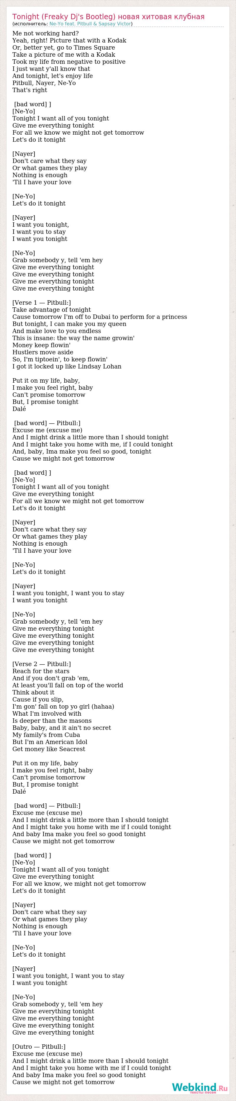 Me not working hard? Yeah, right! Picture that with a Kodak Or, better yet, go to Times Square Take a picture of me with a Kodak Took my life from negative to positive I just want y'all know that And tonight, let's enjoy life Pitbull, Nayer, Ne-Yo That's right [bad word] ] [Ne-Yo] Tonight I want all of you tonight Give me everything tonight For all we know we might not get tomorrow Let's do it tonight [Nayer] Don't care what they say Or what games they play Nothing is enough 'Til I have your love [Ne-Yo] Let's do it tonight [Nayer] I want you tonight, I want you to stay I want you tonight [Ne-Yo] Grab somebody y, tell 'em hey Give me everything tonight Give me everything tonight Give me everything tonight Give me everything tonight [Verse 1 — Pitbull:] Take advantage of tonight Cause tomorrow I'm off to Dubai to perform for a princess But tonight, I can make you my queen And make love to you endless This is insane: the way the name growin' Money keep flowin' Hustlers move aside So, I'm tiptoein', to keep flowin' I got it locked up like Lindsay Lohan Put it on my life, baby, I make you feel right, baby Can't promise tomorrow But, I promise tonight Dalé [bad word] — Pitbull:] Excuse me (excuse me) And I might drink a little more than I should tonight And I might take you home with me, if I could tonight And, baby, Ima make you feel so good, tonight Cause we might not get tomorrow [bad word] ] [Ne-Yo] Tonight I want all of you tonight Give me everything tonight For all we know we might not get tomorrow Let's do it tonight [Nayer] Don't care what they say Or what games they play Nothing is enough 'Til I have your love [Ne-Yo] Let's do it tonight [Nayer] I want you tonight, I want you to stay I want you tonight [Ne-Yo] Grab somebody y, tell 'em hey Give me everything tonight Give me everything tonight Give me everything tonight Give me everything tonight [Verse 2 — Pitbull:] Reach for the stars And if you don't grab 'em, At least you'll fall on top of the world Think about it Cause if you slip, I'm gon' fall on top yo girl (hahaa) What I'm involved with Is deeper than the masons Baby, baby, and it ain't no secret My family's from Cuba But I'm an American Idol Get money like Seacrest Put it on my life, baby I make you feel right, baby Can't promise tomorrow But, I promise tonight Dalé [bad word] — Pitbull:] Excuse me (excuse me) And I might drink a little more than I should tonight And I might take you home with me if I could tonight And baby Ima make you feel so good tonight Cause we might not get tomorrow [bad word] ] [Ne-Yo] Tonight I want all of you tonight Give me everything tonight For all we know, we might not get tomorrow Let's do it tonight [Nayer] Don't care what they say Or what games they play Nothing is enough 'Til I have your love [Ne-Yo] Let's do it tonight [Nayer] I want you tonight, I want you to stay I want you tonight [Ne-Yo] Grab somebody y, tell 'em hey Give me everything tonight Give me everything tonight Give me everything tonight Give me everything tonight [Outro — Pitbull:] Excuse me (excuse me) And I might drink a little more than I should tonight And I might take you home with me if I could tonight And baby Ima make you feel so good tonight Cause we might not get tomorrow