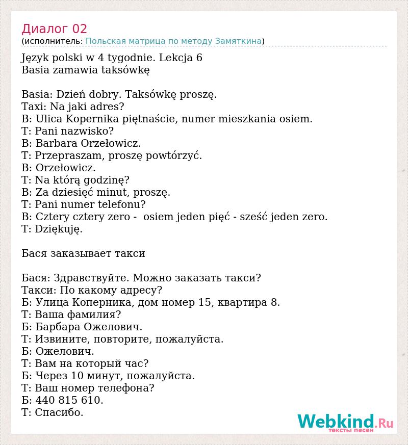 Język polski w 4 tygodnie. Lekcja 6 Basia zamawia taksówkę Basia: Dzień dobry. Taksówkę proszę. Taxi: Na jaki adres? B: Ulica Kopernika piętnaście, numer mieszkania osiem. T: Pani nazwisko? B: Barbara Orzełowicz. T: Przepraszam, proszę powtórzyć. B: Orzełowicz. T: Na którą godzinę? B: Za dziesięć minut, proszę. T: Pani numer telefonu? B: Cztery cztery zero - osiem jeden pięć - sześć jeden zero. T: Dziękuję. Бася заказывает такси Бася: Здравствуйте. Можно заказать такси? Такси: По какому адресу? Б: Улица Коперника, дом номер 15, квартира 8. Т: Ваша фамилия? Б: Барбара Ожелович. Т: Извините, повторите, пожалуйста. Б: Ожелович. Т: Вам на который час? Б: Через 10 минут, пожалуйста. Т: Ваш номер телефона? Б: 440 815 610. Т: Спасибо.