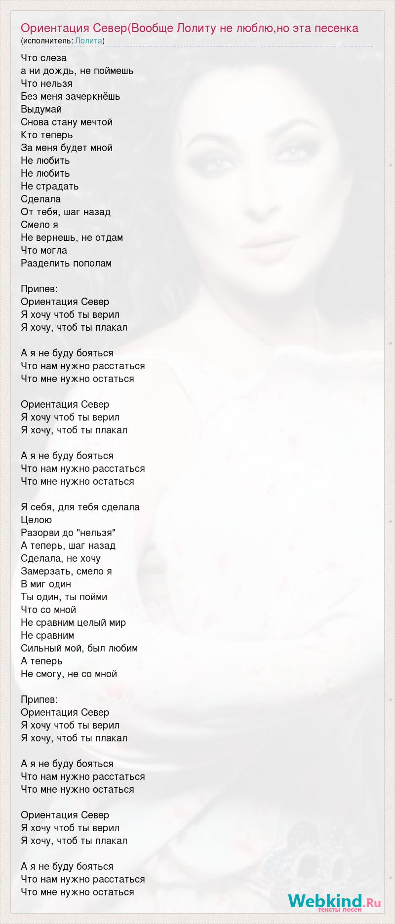 Что слеза а ни дождь, не поймешь Что нельзя Без меня зачеркнёшь Выдумай Снова стану мечтой Кто теперь За меня будет мной Не любить Не любить Не страдать Сделала От тебя, шаг назад Смело я Не вернешь, не отдам Что могла Разделить пополам Припев: Ориентация Север Я хочу чтоб ты верил Я хочу, чтоб ты плакал А я не буду бояться Что нам нужно расстаться Что мне нужно остаться Ориентация Север Я хочу чтоб ты верил Я хочу, чтоб ты плакал А я не буду бояться Что нам нужно расстаться Что мне нужно остаться Я себя, для тебя сделала Целою Разорви до "нельзя" А теперь, шаг назад Сделала, не хочу Замерзать, смело я В миг один Ты один, ты пойми Что со мной Не сравним целый мир Не сравним Сильный мой, был любим А теперь Не смогу, не со мной Припев: Ориентация Север Я хочу чтоб ты верил Я хочу, чтоб ты плакал А я не буду бояться Что нам нужно расстаться Что мне нужно остаться Ориентация Север Я хочу чтоб ты верил Я хочу, чтоб ты плакал А я не буду бояться Что нам нужно расстаться Что мне нужно остаться