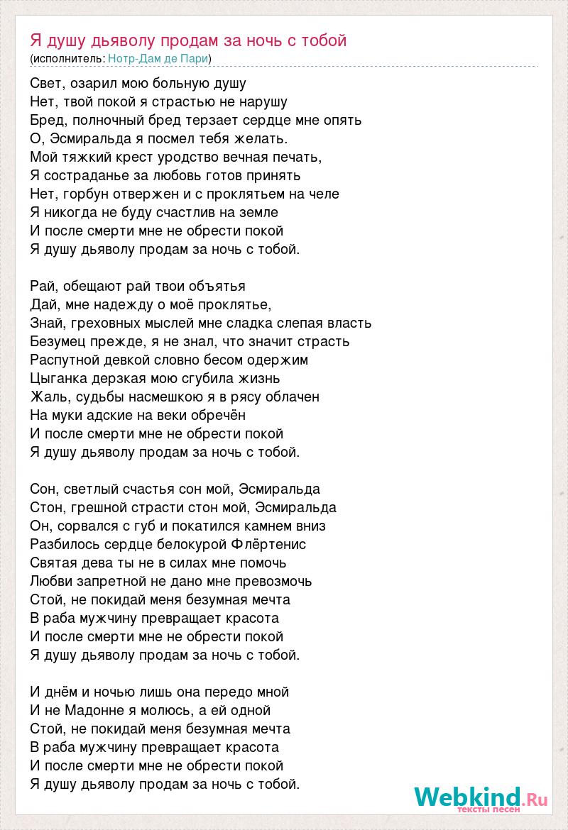 Свет, озарил мою больную душу Нет, твой покой я страстью не нарушу Бред, полночный бред терзает сердце мне опять О, Эсмиральда я посмел тебя желать. Мой тяжкий крест уродство вечная печать, Я состраданье за любовь готов принять Нет, горбун отвержен и с проклятьем на челе Я никогда не буду счастлив на земле И после смерти мне не обрести покой Я душу дьяволу продам за ночь с тобой. Рай, обещают рай твои объятья Дай, мне надежду о моё проклятье, Знай, греховных мыслей мне сладка слепая власть Безумец прежде, я не знал, что значит страсть Распутной девкой словно бесом одержим Цыганка дерзкая мою сгубила жизнь Жаль, судьбы насмешкою я в рясу облачен На муки адские на веки обречён И после смерти мне не обрести покой Я душу дьяволу продам за ночь с тобой. Сон, светлый счастья сон мой, Эсмиральда Стон, грешной страсти стон мой, Эсмиральда Он, сорвался с губ и покатился камнем вниз Разбилось сердце белокурой Флёртенис Святая дева ты не в силах мне помочь Любви запретной не дано мне превозмочь Стой, не покидай меня безумная мечта В раба мужчину превращает красота И после смерти мне не обрести покой Я душу дьяволу продам за ночь с тобой. И днём и ночью лишь она передо мной И не Мадонне я молюсь, а ей одной Стой, не покидай меня безумная мечта В раба мужчину превращает красота И после смерти мне не обрести покой Я душу дьяволу продам за ночь с тобой.