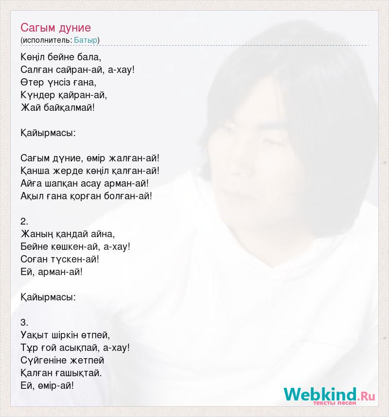 Көңіл бейне бала, Салған сайран-ай, а-хау! Өтер үнсіз ғана, Күндер қайран-ай, Жай байқалмай! Қайырмасы: Сағым дүние, өмір жалған-ай! Қанша жерде көңіл қалған-ай! Айға шапқан асау арман-ай! Ақыл ғана қорған болған-ай! 2. Жаның қандай айна, Бейне көшкен-ай, а-хау! Соған түскен-ай! Ей, арман-ай! Қайырмасы: 3. Уақыт шіркін өтпей, Тұр ғой асықпай, а-хау! Сүйгеніне жетпей Қалған ғашықтай. Ей, өмір-ай!