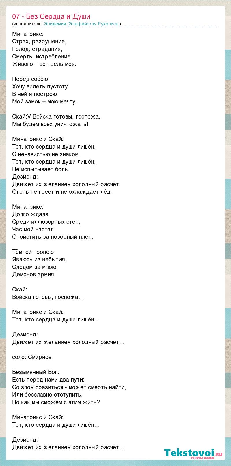 Минатрикс: Страх, разрушение, Голод, страдания, Смерть, истребление Живого – вот цель моя. Перед собою Хочу видеть пустоту, В ней я построю Мой замок – мою мечту. Скай:V Войска готовы, госпожа, Мы будем всех уничтожать! Минатрикс и Скай: Тот, кто сердца и души лишён, С ненавистью не знаком. Тот, кто сердца и души лишён, Не испытывает боль. Дезмонд: Движет их желанием холодный расчёт, Огонь не греет и не охлаждает лёд. Минатрикс: Долго ждала Среди иллюзорных стен, Час мой настал Отомстить за позорный плен. Тёмной тропою Явлюсь из небытия, Следом за мною Демонов армия. Скай: Войска готовы, госпожа… Минатрикс и Скай: Тот, кто сердца и души лишён… Дезмонд: Движет их желанием холодный расчёт… соло: Смирнов Безымянный Бог: Есть перед нами два пути: Со злом сразиться - может смерть найти, Или бесславно отступить, Но как мы сможем с этим жить? Минатрикс и Скай: Тот, кто сердца и души лишён… Дезмонд: Движет их желанием холодный расчёт…