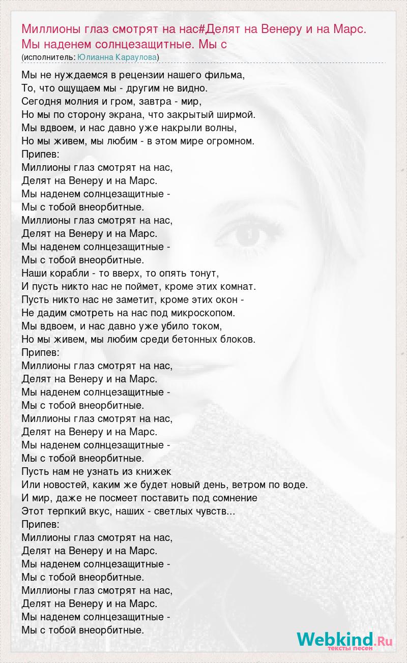 Главная→Исполнители→Юлианна Караулова→Миллионы глаз смотрят на нас#Делят на Венеру и на Марс. Мы наденем солнцезащитны
