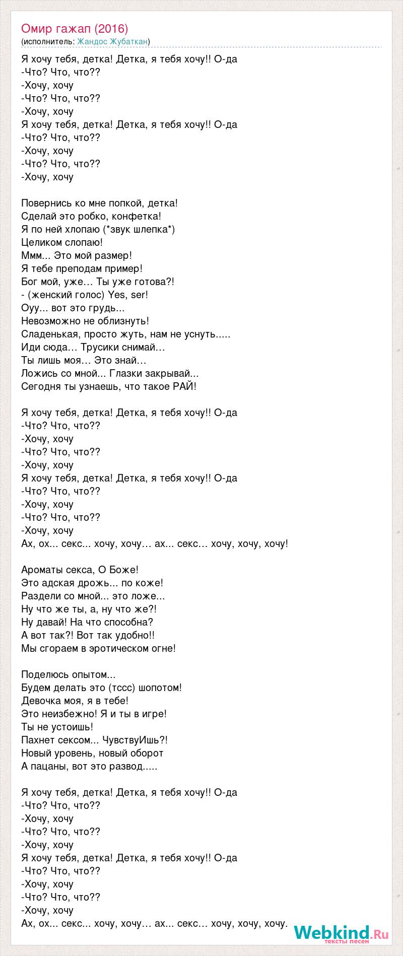 Я хочу тебя, детка! Детка, я тебя хочу!! О-да -Что? Что, что?? -Хочу, хочу -Что? Что, что?? -Хочу, хочу Я хочу тебя, детка! Детка, я тебя хочу!! О-да -Что? Что, что?? -Хочу, хочу -Что? Что, что?? -Хочу, хочу Повернись ко мне попкой, детка! Сделай это робко, конфетка! Я по ней хлопаю (*звук шлепка*) Целиком слопаю! Ммм... Это мой размер! Я тебе преподам пример! Бог мой, уже… Ты уже готова?! - (женский голос) Yes, ser! Оуу... вот это грудь... Невозможно не облизнуть! Сладенькая, просто жуть, нам не уснуть..... Иди сюда… Трусики снимай… Ты лишь моя… Это знай… Ложись со мной... Глазки закрывай... Сегодня ты узнаешь, что такое РАЙ! Я хочу тебя, детка! Детка, я тебя хочу!! О-да -Что? Что, что?? -Хочу, хочу -Что? Что, что?? -Хочу, хочу Я хочу тебя, детка! Детка, я тебя хочу!! О-да -Что? Что, что?? -Хочу, хочу -Что? Что, что?? -Хочу, хочу Ах, ох... секс... хочу, хочу… ах... секс… хочу, хочу, хочу! Ароматы секса, О Боже! Это адская дрожь... по коже! Раздели со мной... это ложе... Ну что же ты, а, ну что же?! Ну давай! На что способна? А вот так?! Вот так удобно!! Мы сгораем в эротическом огне! Поделюсь опытом... Будем делать это (тссс) шопотом! Девочка моя, я в тебе! Это неизбежно! Я и ты в игре! Ты не устоишь! Пахнет сексом... ЧувствуИшь?! Новый уровень, новый оборот А пацаны, вот это развод..... Я хочу тебя, детка! Детка, я тебя хочу!! О-да -Что? Что, что?? -Хочу, хочу -Что? Что, что?? -Хочу, хочу Я хочу тебя, детка! Детка, я тебя хочу!! О-да -Что? Что, что?? -Хочу, хочу -Что? Что, что?? -Хочу, хочу Ах, ох... секс... хочу, хочу… ах... секс… хочу, хочу, хочу.