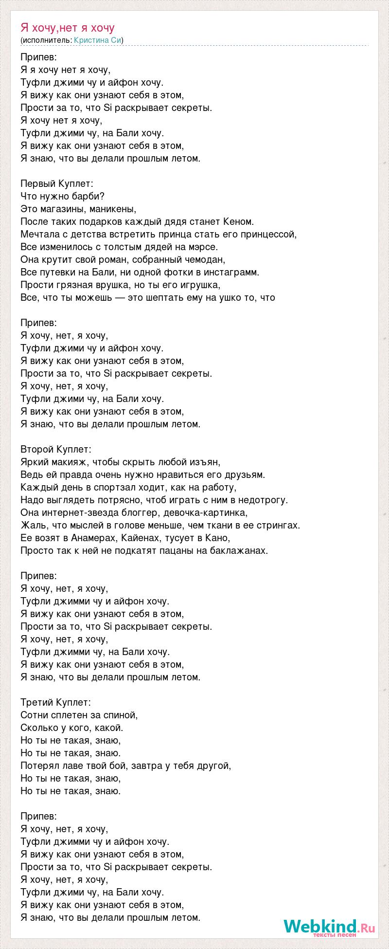 Припев: Я я хочу нет я хочу, Туфли джими чу и айфон хочу. Я вижу как они узнают себя в этом, Прости за то, что Si раскрывает секреты. Я хочу нет я хочу, Туфли джими чу, на Бали хочу. Я вижу как они узнают себя в этом, Я знаю, что вы делали прошлым летом. Первый Куплет: Что нужно барби? Это магазины, маникены, После таких подарков каждый дядя станет Кеном. Мечтала с детства встретить принца стать его принцессой, Все изменилось с толстым дядей на мэрсе. Она крутит свой роман, собранный чемодан, Все путевки на Бали, ни одной фотки в инстаграмм. Прости грязная врушка, но ты его игрушка, Все, что ты можешь — это шептать ему на ушко то, что Припев: Я хочу, нет, я хочу, Туфли джими чу и айфон хочу. Я вижу как они узнают себя в этом, Прости за то, что Si раскрывает секреты. Я хочу, нет, я хочу, Туфли джими чу, на Бали хочу. Я вижу как они узнают себя в этом, Я знаю, что вы делали прошлым летом. Второй Куплет: Яркий макияж, чтобы скрыть любой изъян, Ведь ей правда очень нужно нравиться его друзьям. Каждый день в спортзал ходит, как на работу, Надо выглядеть потрясно, чтоб играть с ним в недотрогу. Она интернет-звезда блоггер, девочка-картинка, Жаль, что мыслей в голове меньше, чем ткани в ее стрингах. Ее возят в Анамерах, Кайенах, тусует в Кано, Просто так к ней не подкатят пацаны на баклажанах. Припев: Я хочу, нет, я хочу, Туфли джимми чу и айфон хочу. Я вижу как они узнают себя в этом, Прости за то, что Si раскрывает секреты. Я хочу, нет, я хочу, Туфли джимми чу, на Бали хочу. Я вижу как они узнают себя в этом, Я знаю, что вы делали прошлым летом. Третий Куплет: Сотни сплетен за спиной, Сколько у кого, какой. Но ты не такая, знаю, Но ты не такая, знаю. Потерял лаве твой бой, завтра у тебя другой, Но ты не такая, знаю, Но ты не такая, знаю. Припев: Я хочу, нет, я хочу, Туфли джимми чу и айфон хочу. Я вижу как они узнают себя в этом, Прости за то, что Si раскрывает секреты. Я хочу, нет, я хочу, Туфли джими чу, на Бали хочу. Я вижу как они узнают себя в этом, Я знаю, что вы делали прошлым летом.