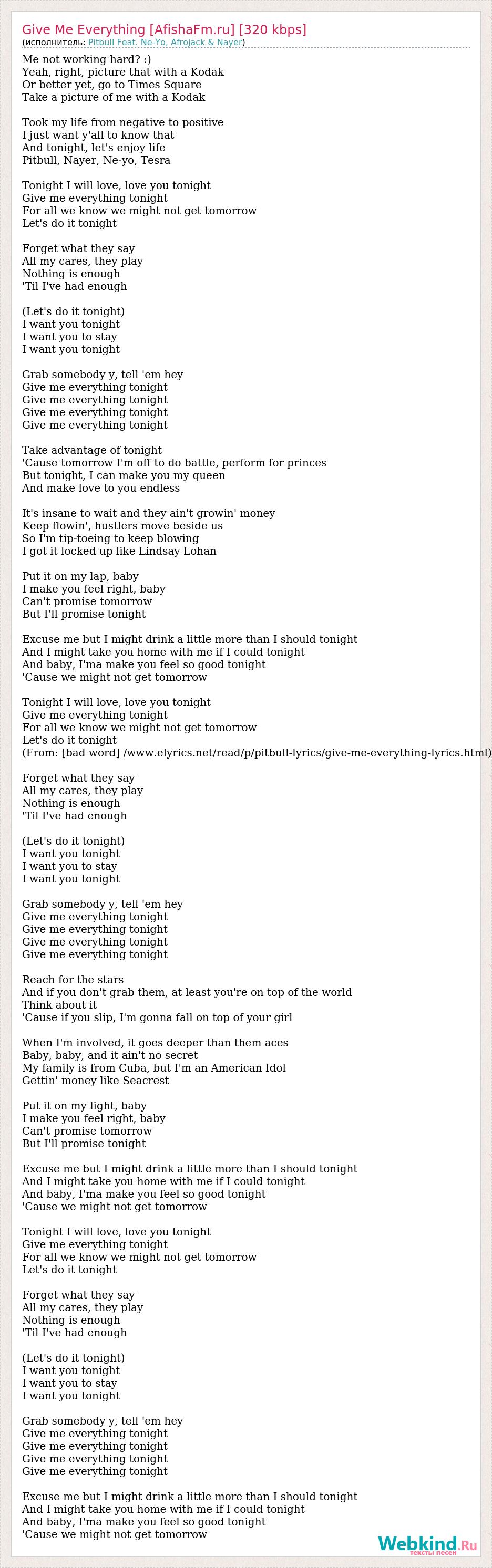Me not working hard? :) Yeah, right, picture that with a Kodak Or better yet, go to Times Square Take a picture of me with a Kodak Took my life from negative to positive I just want y'all to know that And tonight, let's enjoy life Pitbull, Nayer, Ne-yo, Tesra Tonight I will love, love you tonight Give me everything tonight For all we know we might not get tomorrow Let's do it tonight Forget what they say All my cares, they play Nothing is enough 'Til I've had enough (Let's do it tonight) I want you tonight I want you to stay I want you tonight Grab somebody y, tell 'em hey Give me everything tonight Give me everything tonight Give me everything tonight Give me everything tonight Take advantage of tonight 'Cause tomorrow I'm off to do battle, perform for princes But tonight, I can make you my queen And make love to you endless It's insane to wait and they ain't growin' money Keep flowin', hustlers move beside us So I'm tip-toeing to keep blowing I got it locked up like Lindsay Lohan Put it on my lap, baby I make you feel right, baby Can't promise tomorrow But I'll promise tonight Excuse me but I might drink a little more than I should tonight And I might take you home with me if I could tonight And baby, I'ma make you feel so good tonight 'Cause we might not get tomorrow Tonight I will love, love you tonight Give me everything tonight For all we know we might not get tomorrow Let's do it tonight (From: [bad word] /www.elyrics.net/read/p/pitbull-lyrics/give-me-everything-lyrics.html) Forget what they say All my cares, they play Nothing is enough 'Til I've had enough (Let's do it tonight) I want you tonight I want you to stay I want you tonight Grab somebody y, tell 'em hey Give me everything tonight Give me everything tonight Give me everything tonight Give me everything tonight Reach for the stars And if you don't grab them, at least you're on top of the world Think about it 'Cause if you slip, I'm gonna fall on top of your girl When I'm involved, it goes deeper than them aces Baby, baby, and it ain't no secret My family is from Cuba, but I'm an American Idol Gettin' money like Seacrest Put it on my light, baby I make you feel right, baby Can't promise tomorrow But I'll promise tonight Excuse me but I might drink a little more than I should tonight And I might take you home with me if I could tonight And baby, I'ma make you feel so good tonight 'Cause we might not get tomorrow Tonight I will love, love you tonight Give me everything tonight For all we know we might not get tomorrow Let's do it tonight Forget what they say All my cares, they play Nothing is enough 'Til I've had enough (Let's do it tonight) I want you tonight I want you to stay I want you tonight Grab somebody y, tell 'em hey Give me everything tonight Give me everything tonight Give me everything tonight Give me everything tonight Excuse me but I might drink a little more than I should tonight And I might take you home with me if I could tonight And baby, I'ma make you feel so good tonight 'Cause we might not get tomorrow