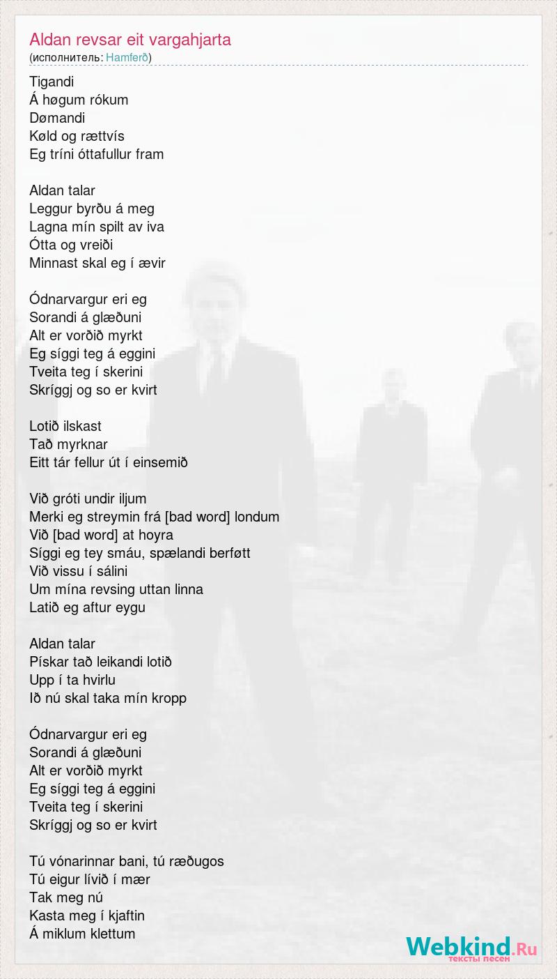 Tigandi Á høgum rókum Dømandi Køld og rættvís Eg tríni óttafullur fram Aldan talar Leggur byrðu á meg Lagna mín spilt av iva Ótta og vreiði Minnast skal eg í ævir Ódnarvargur eri eg Sorandi á glæðuni Alt er vorðið myrkt Eg síggi teg á eggini Tveita teg í skerini Skríggj og so er kvirt Lotið ilskast Tað myrknar Eitt tár fellur út í einsemið Við gróti undir iljum Merki eg streymin frá [bad word] londum Við [bad word] at hoyra Síggi eg tey smáu, spælandi berføtt Við vissu í sálini Um mína revsing uttan linna Latið eg aftur eygu Aldan talar Pískar tað leikandi lotið Upp í ta hvirlu Ið nú skal taka mín kropp Ódnarvargur eri eg Sorandi á glæðuni Alt er vorðið myrkt Eg síggi teg á eggini Tveita teg í skerini Skríggj og so er kvirt Tú vónarinnar bani, tú ræðugos Tú eigur lívið í mær Tak meg nú Kasta meg í kjaftin Á miklum klettum