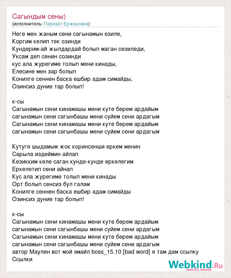Неге мен жаным сени сагынамын езиле, Коргим келип тек озинди Кундерим-ай жылдардай болып маган сезиледи, Уксам деп сенин созинди кус ала журегиме толып мени кинады, Елесине мен зар болып Конилге сеннен баска ешбир адам симайды, Озинсиз дуние тар болып! к-сы Сагынамын сени кинамашы мени куте берем ардайым сагынамын сени сагынбашы мени суйем сени ардагым Сагынамын сени кинамашы мени куте берем ардайым сагынамын сени сагынбашы мени суйем сени ардагым Кутуге шыдамым жок коринсенши еркем менин Сарыла издеймин айлап Кезикким келе саган кунде-кунде еркелегим Еркелетип сени айнап Кус ала журегиме толып мени кинады Орт болып сенсиз бул галам Конилге сеннен баска ешбир адам симайды Озинсиз дуние тар болып! к-сы Сагынамын сени кинамашы мени куте берем ардайым сагынамын сени сагынбашы мени суйем сени ардагым Сагынамын сени кинамашы мени куте берем ардайым сагынамын сени сагынбашы мени суйем сени ардагым автор Маулен вот мой эмайл boss_15.10 [bad word] я там дам ссылку Ссылки