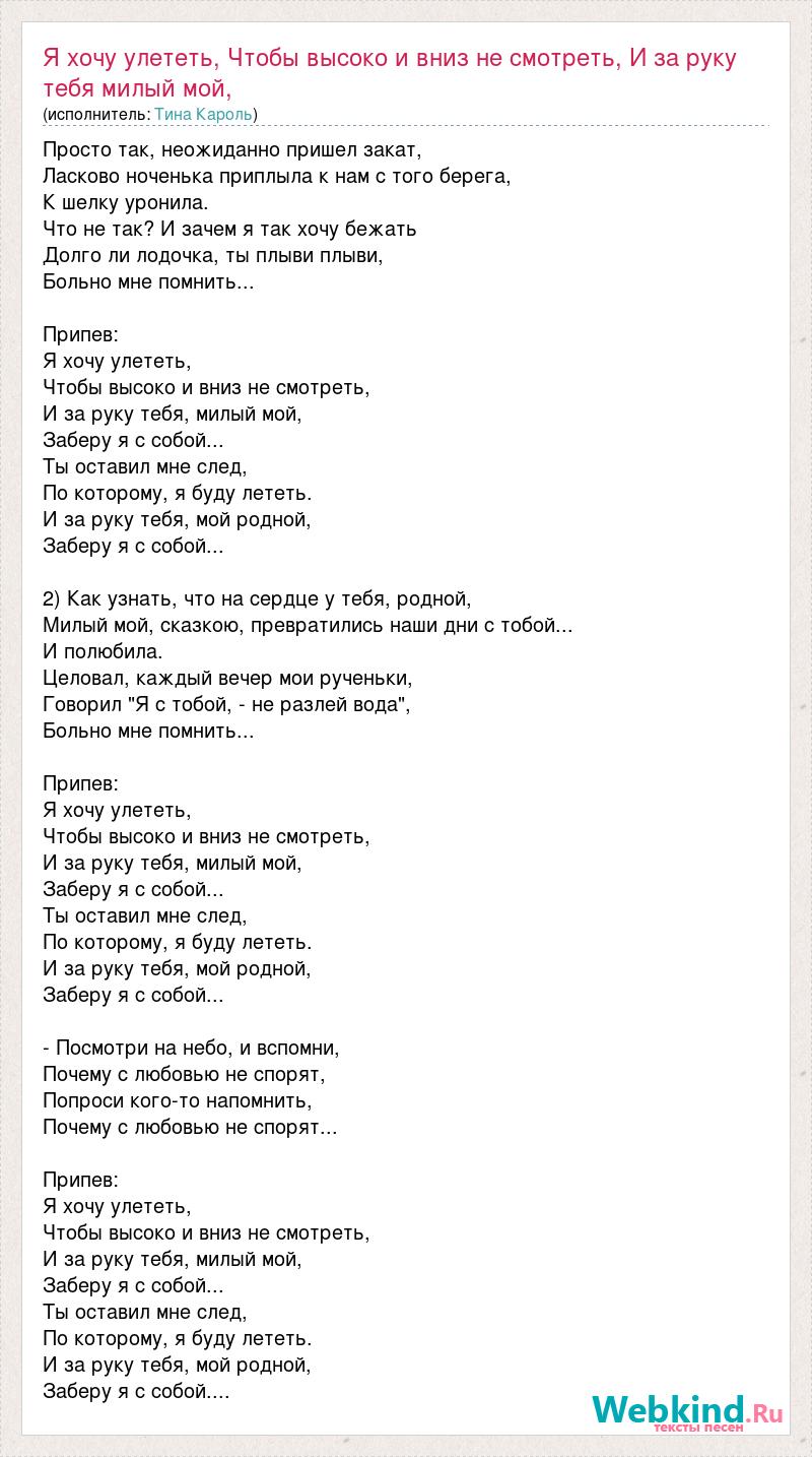 Просто так, неожиданно пришел закат, Ласково ноченька приплыла к нам с того берега, К шелку уронила. Что не так? И зачем я так хочу бежать Долго ли лодочка, ты плыви плыви, Больно мне помнить... Припев: Я хочу улететь, Чтобы высоко и вниз не смотреть, И за руку тебя, милый мой, Заберу я с собой... Ты оставил мне след, По которому, я буду лететь. И за руку тебя, мой родной, Заберу я с собой... 2) Как узнать, что на сердце у тебя, родной, Милый мой, сказкою, превратились наши дни с тобой... И полюбила. Целовал, каждый вечер мои рученьки, Говорил "Я с тобой, - не разлей вода", Больно мне помнить... Припев: Я хочу улететь, Чтобы высоко и вниз не смотреть, И за руку тебя, милый мой, Заберу я с собой... Ты оставил мне след, По которому, я буду лететь. И за руку тебя, мой родной, Заберу я с собой... - Посмотри на небо, и вспомни, Почему с любовью не спорят, Попроси кого-то напомнить, Почему с любовью не спорят... Припев: Я хочу улететь, Чтобы высоко и вниз не смотреть, И за руку тебя, милый мой, Заберу я с собой... Ты оставил мне след, По которому, я буду лететь. И за руку тебя, мой родной, Заберу я с собой....
