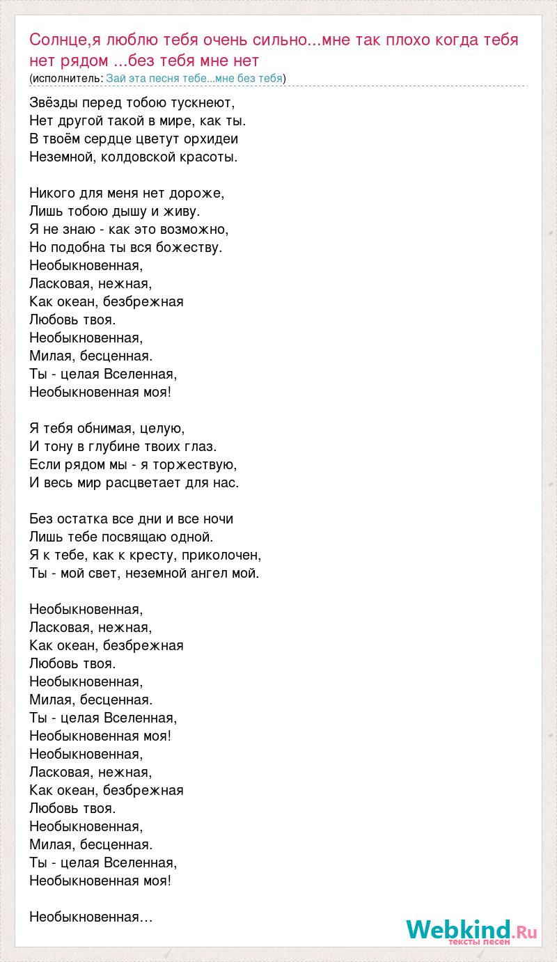 Звёзды перед тобою тускнеют, Нет другой такой в мире, как ты. В твоём сердце цветут орхидеи Неземной, колдовской красоты. Никого для меня нет дороже, Лишь тобою дышу и живу. Я не знаю - как это возможно, Но подобна ты вся божеству. Необыкновенная, Ласковая, нежная, Как океан, безбрежная Любовь твоя. Необыкновенная, Милая, бесценная. Ты - целая Вселенная, Необыкновенная моя! Я тебя обнимая, целую, И тону в глубине твоих глаз. Если рядом мы - я торжествую, И весь мир расцветает для нас. Без остатка все дни и все ночи Лишь тебе посвящаю одной. Я к тебе, как к кресту, приколочен, Ты - мой свет, неземной ангел мой. Необыкновенная, Ласковая, нежная, Как океан, безбрежная Любовь твоя. Необыкновенная, Милая, бесценная. Ты - целая Вселенная, Необыкновенная моя! Необыкновенная, Ласковая, нежная, Как океан, безбрежная Любовь твоя. Необыкновенная, Милая, бесценная. Ты - целая Вселенная, Необыкновенная моя! Необыкновенная…