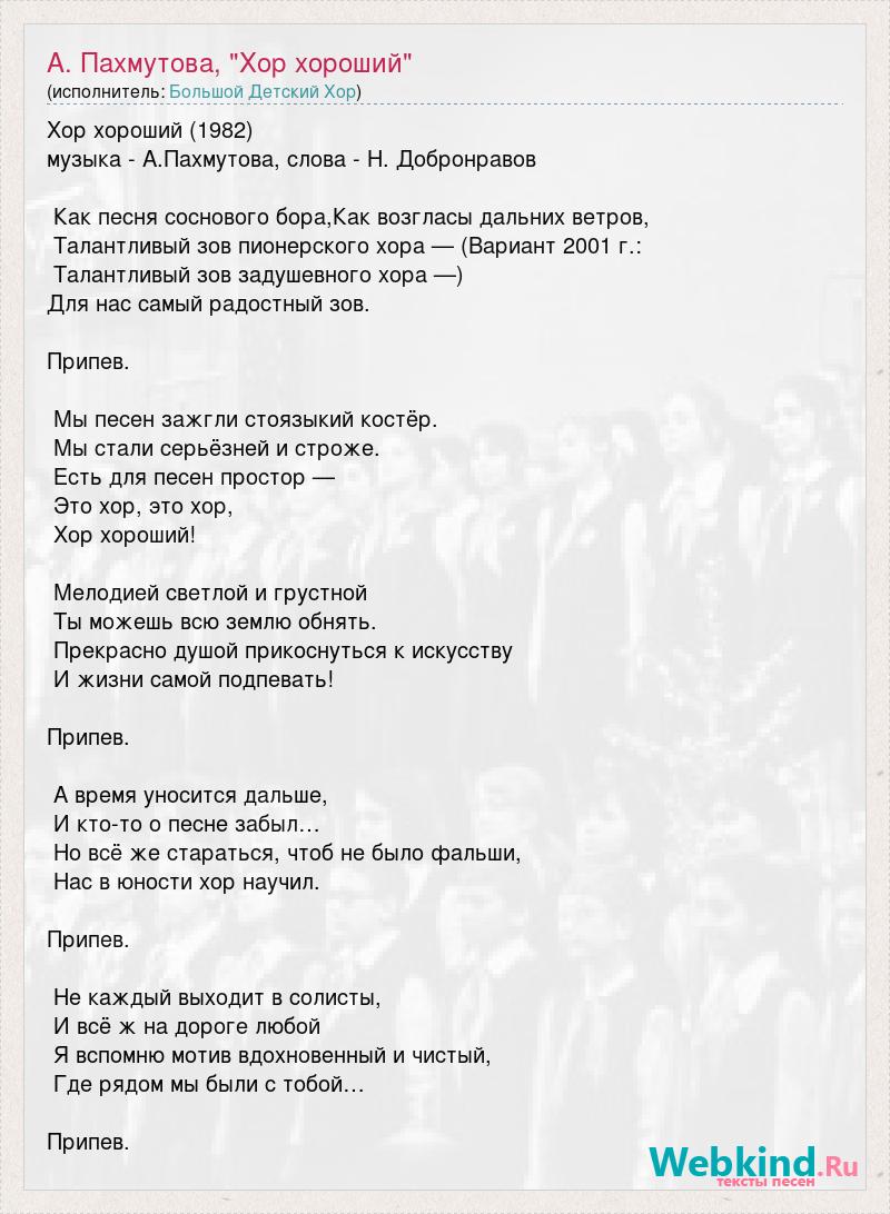 Хор хороший (1982) музыка - А.Пахмутова, слова - Н. Добронравов Как песня соснового бора,Как возгласы дальних ветров, Талантливый зов пионерского хора — (Вариант 2001 г.: Талантливый зов задушевного хора —) Для нас самый радостный зов. Припев. Мы песен зажгли стоязыкий костёр. Мы стали серьёзней и строже. Есть для песен простор — Это хор, это хор, Хор хороший! Мелодией светлой и грустной Ты можешь всю землю обнять. Прекрасно душой прикоснуться к искусству И жизни самой подпевать! Припев. А время уносится дальше, И кто-то о песне забыл… Но всё же стараться, чтоб не было фальши, Нас в юности хор научил. Припев. Не каждый выходит в солисты, И всё ж на дороге любой Я вспомню мотив вдохновенный и чистый, Где рядом мы были с тобой… Припев.