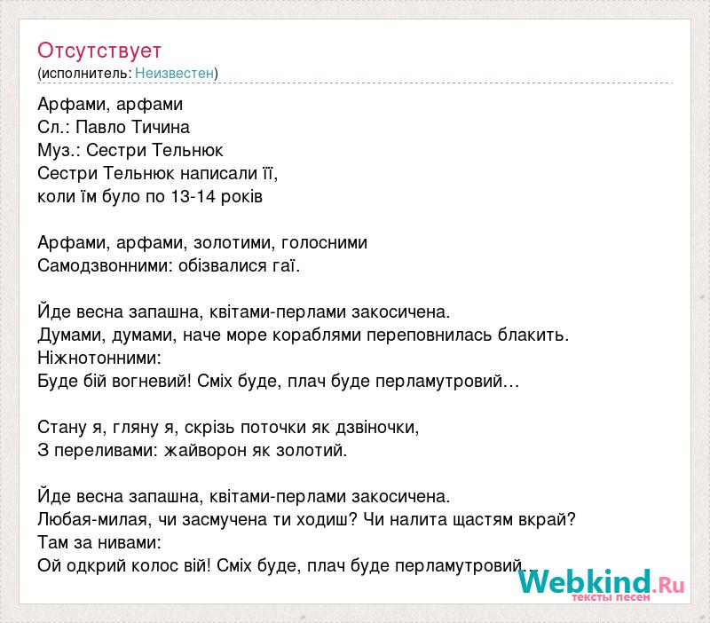 Арфами, арфами Сл.: Павло Тичина Муз.: Сестри Тельнюк Сестри Тельнюк написали її, коли їм було по 13-14 років Арфами, арфами, золотими, голосними Самодзвонними: обізвалися гаї. Йде весна запашна, квітами-перлами закосичена. Думами, думами, наче море кораблями переповнилась блакить. Ніжнотонними: Буде бій вогневий! Сміх буде, плач буде перламутровий… Стану я, гляну я, скрізь поточки як дзвіночки, З переливами: жайворон як золотий. Йде весна запашна, квітами-перлами закосичена. Любая-милая, чи засмучена ти ходиш? Чи налита щастям вкрай? Там за нивами: Ой одкрий колос вій! Сміх буде, плач буде перламутровий…