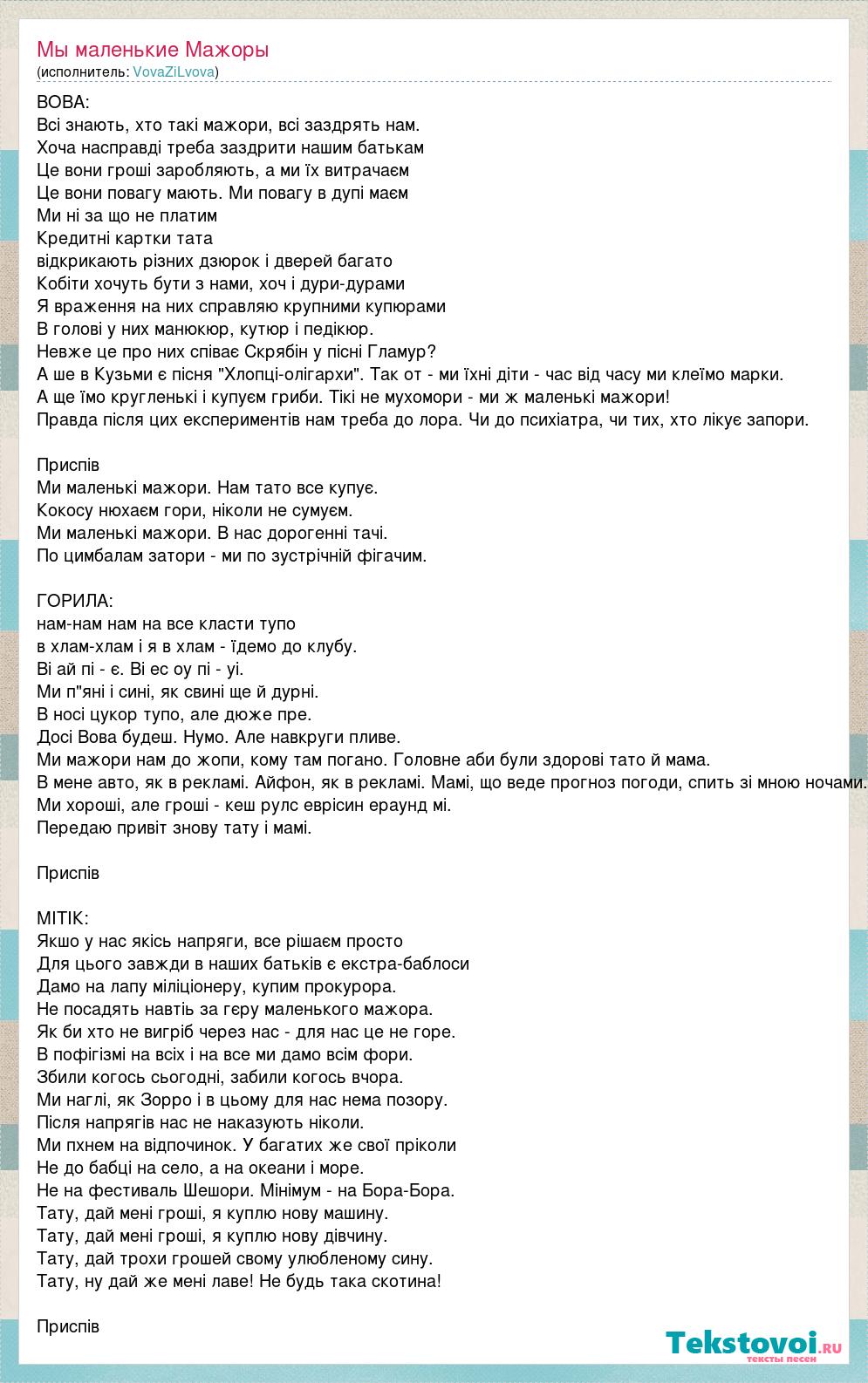 ВОВА: Всі знають, хто такі мажори, всі заздрять нам. Хоча насправді треба заздрити нашим батькам Це вони гроші заробляють, а ми їх витрачаєм Це вони повагу мають. Ми повагу в дупі маєм Ми ні за що не платим Кредитні картки тата відкрикають різних дзюрок і дверей багато Кобіти хочуть бути з нами, хоч і дури-дурами Я враження на них справляю крупними купюрами В голові у них манюкюр, кутюр і педікюр. Невже це про них співає Скрябін у пісні Гламур? А ше в Кузьми є пісня "Хлопці-олігархи". Так от - ми їхні діти - час від часу ми клеїмо марки. А ще їмо кругленькі і купуєм гриби. Тікі не мухомори - ми ж маленькі мажори! Правда після цих експериментів нам треба до лора. Чи до психіатра, чи тих, хто лікує запори. Приспів Ми маленькі мажори. Нам тато все купує. Кокосу нюхаєм гори, ніколи не сумуєм. Ми маленькі мажори. В нас дорогенні тачі. По цимбалам затори - ми по зустрічній фігачим. ГОРИЛА: нам-нам нам на все класти тупо в хлам-хлам і я в хлам - їдемо до клубу. Ві ай пі - є. Ві ес оу пі - уі. Ми п"яні і сині, як свині ще й дурні. В носі цукор тупо, але дюже пре. Досі Вова будеш. Нумо. Але навкруги пливе. Ми мажори нам до жопи, кому там погано. Головне аби були здорові тато й мама. В мене авто, як в рекламі. Айфон, як в рекламі. Мамі, що веде прогноз погоди, спить зі мною ночами. Ми хороші, але гроші - кеш рулс еврісин ераунд мі. Передаю привіт знову тату і мамі. Приспів МІТІК: Якшо у нас якісь напряги, все рішаєм просто Для цього завжди в наших батьків є екстра-баблоси Дамо на лапу міліціонеру, купим прокурора. Не посадять навтіь за гєру маленького мажора. Як би хто не вигріб через нас - для нас це не горе. В пофігізмі на всіх і на все ми дамо всім фори. Збили когось сьогодні, забили когось вчора. Ми наглі, як Зорро і в цьому для нас нема позору. Після напрягів нас не наказують ніколи. Ми пхнем на відпочинок. У багатих же свої пріколи Не до бабці на село, а на океани і море. Не на фестиваль Шешори. Мінімум - на Бора-Бора. Тату, дай мені гроші, я куплю нову машину. Тату, дай мені гроші, я куплю нову дівчину. Тату, дай трохи грошей свому улюбленому сину. Тату, ну дай же мені лаве! Не будь така скотина! Приспів