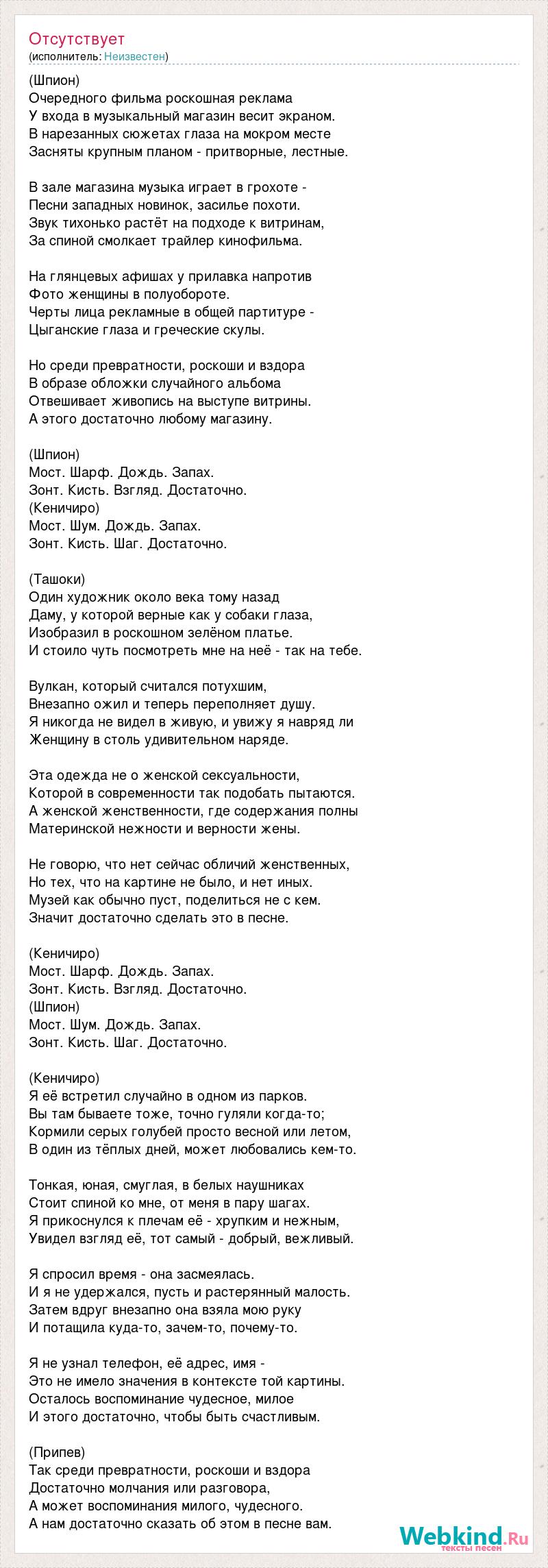 (Шпион) Очередного фильма роскошная реклама У входа в музыкальный магазин весит экраном. В нарезанных сюжетах глаза на мокром месте Засняты крупным планом - притворные, лестные. В зале магазина музыка играет в грохоте - Песни западных новинок, засилье похоти. Звук тихонько растёт на подходе к витринам, За спиной смолкает трайлер кинофильма. На глянцевых афишах у прилавка напротив Фото женщины в полуобороте. Черты лица рекламные в общей партитуре - Цыганские глаза и греческие скулы. Но среди превратности, роскоши и вздора В образе обложки случайного альбома Отвешивает живопись на выступе витрины. А этого достаточно любому магазину. (Шпион) Мост. Шарф. Дождь. Запах. Зонт. Кисть. Взгляд. Достаточно. (Кеничиро) Мост. Шум. Дождь. Запах. Зонт. Кисть. Шаг. Достаточно. (Ташоки) Один художник около века тому назад Даму, у которой верные как у собаки глаза, Изобразил в роскошном зелёном платье. И стоило чуть посмотреть мне на неё - так на тебе. Вулкан, который считался потухшим, Внезапно ожил и теперь переполняет душу. Я никогда не видел в живую, и увижу я навряд ли Женщину в столь удивительном наряде. Эта одежда не о женской сексуальности, Которой в современности так подобать пытаются. А женской женственности, где содержания полны Материнской нежности и верности жены. Не говорю, что нет сейчас обличий женственных, Но тех, что на картине не было, и нет иных. Музей как обычно пуст, поделиться не с кем. Значит достаточно сделать это в песне. (Кеничиро) Мост. Шарф. Дождь. Запах. Зонт. Кисть. Взгляд. Достаточно. (Шпион) Мост. Шум. Дождь. Запах. Зонт. Кисть. Шаг. Достаточно. (Кеничиро) Я её встретил случайно в одном из парков. Вы там бываете тоже, точно гуляли когда-то; Кормили серых голубей просто весной или летом, В один из тёплых дней, может любовались кем-то. Тонкая, юная, смуглая, в белых наушниках Стоит спиной ко мне, от меня в пару шагах. Я прикоснулся к плечам её - хрупким и нежным, Увидел взгляд её, тот самый - добрый, вежливый. Я спросил время - она засмеялась. И я не удержался, пусть и растерянный малость. Затем вдруг внезапно она взяла мою руку И потащила куда-то, зачем-то, почему-то. Я не узнал телефон, её адрес, имя - Это не имело значения в контексте той картины. Осталось воспоминание чудесное, милое И этого достаточно, чтобы быть счастливым. (Припев) Так среди превратности, роскоши и вздора Достаточно молчания или разговора, А может воспоминания милого, чудесного. А нам достаточно сказать об этом в песне вам.