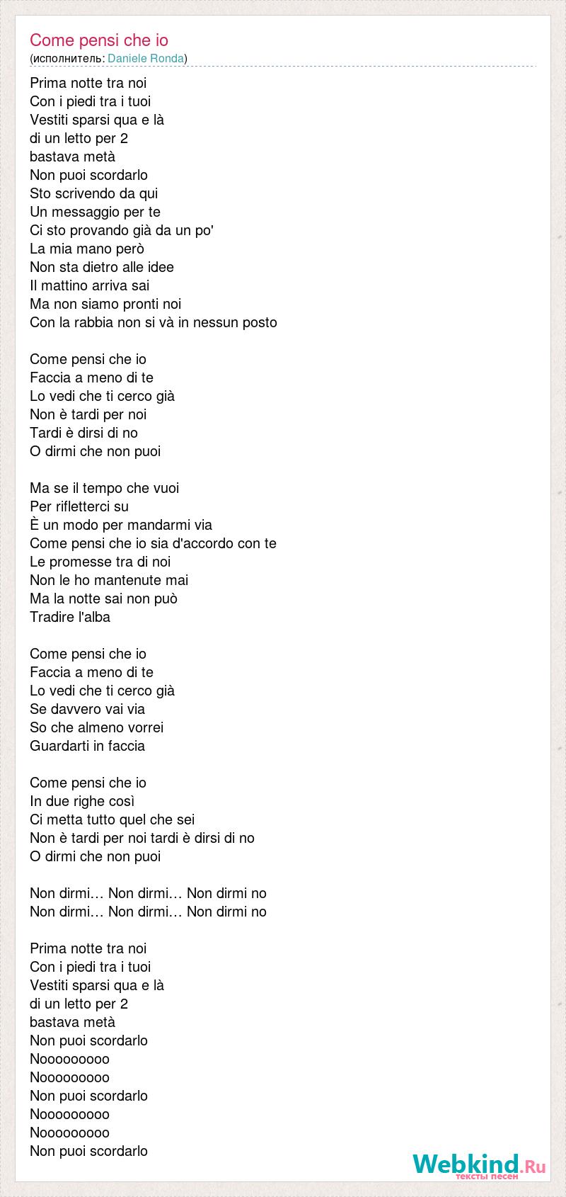 Prima notte tra noi Con i piedi tra i tuoi Vestiti sparsi qua e là di un letto per 2 bastava metà Non puoi scordarlo Sto scrivendo da qui Un messaggio per te Ci sto provando già da un po' La mia mano però Non sta dietro alle idee Il mattino arriva sai Ma non siamo pronti noi Con la rabbia non si và in nessun posto Come pensi che io Faccia a meno di te Lo vedi che ti cerco già Non è tardi per noi Tardi è dirsi di no O dirmi che non puoi Ma se il tempo che vuoi Per rifletterci su È un modo per mandarmi via Come pensi che io sia d'accordo con te Le promesse tra di noi Non le ho mantenute mai Ma la notte sai non può Tradire l'alba Come pensi che io Faccia a meno di te Lo vedi che ti cerco già Se davvero vai via So che almeno vorrei Guardarti in faccia Come pensi che io In due righe così Ci metta tutto quel che sei Non è tardi per noi tardi è dirsi di no O dirmi che non puoi Non dirmi… Non dirmi… Non dirmi no Non dirmi… Non dirmi… Non dirmi no Prima notte tra noi Con i piedi tra i tuoi Vestiti sparsi qua e là di un letto per 2 bastava metà Non puoi scordarlo Nooooooooo Nooooooooo Non puoi scordarlo Nooooooooo Nooooooooo Non puoi scordarlo