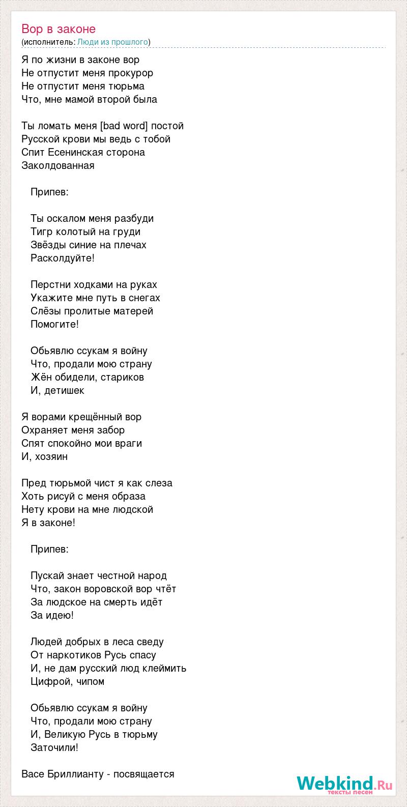 Я по жизни в законе вор Не отпустит меня прокурор Не отпустит меня тюрьма Что, мне мамой второй была Ты ломать меня [bad word] постой Русской крови мы ведь с тобой Спит Есенинская сторона Заколдованная Припев: Ты оскалом меня разбуди Тигр колотый на груди Звёзды синие на плечах Расколдуйте! Перстни ходками на руках Укажите мне путь в снегах Слёзы пролитые матерей Помогите! Обьявлю ссукам я войну Что, продали мою страну Жён обидели, стариков И, детишек Я ворами крещённый вор Охраняет меня забор Спят спокойно мои враги И, хозяин Пред тюрьмой чист я как слеза Хоть рисуй с меня образа Нету крови на мне людской Я в законе! Припев: Пускай знает честной народ Что, закон воровской вор чтёт За людское на смерть идёт За идею! Людей добрых в леса сведу От наркотиков Русь спасу И, не дам русский люд клеймить Цифрой, чипом Обьявлю ссукам я войну Что, продали мою страну И, Великую Русь в тюрьму Заточили! Васе Бриллианту - посвящается