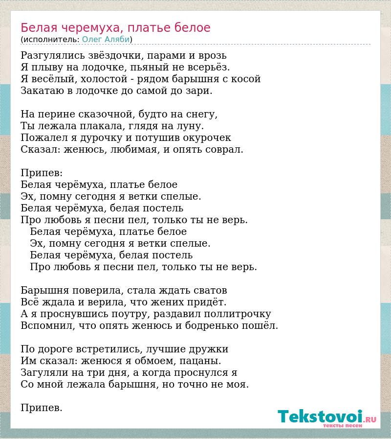 Разгулялись звёздочки, парами и врозь Я плыву на лодочке, пьяный не всерьёз. Я весёлый, холостой - рядом барышня с косой Закатаю в лодочке до самой до зари. На перине сказочной, будто на снегу, Ты лежала плакала, глядя на луну. Пожалел я дурочку и потушив окурочек Сказал: женюсь, любимая, и опять соврал. Припев: Белая черёмуха, платье белое Эх, помну сегодня я ветки спелые. Белая черёмуха, белая постель Про любовь я песни пел, только ты не верь. Белая черёмуха, платье белое Эх, помну сегодня я ветки спелые. Белая черёмуха, белая постель Про любовь я песни пел, только ты не верь. Барышня поверила, стала ждать сватов Всё ждала и верила, что жених придёт. А я проснувшись поутру, раздавил поллитрочку Вспомнил, что опять женюсь и бодренько пошёл. По дороге встретились, лучшие дружки Им сказал: женюся я обмоем, пацаны. Загуляли на три дня, а когда проснулся я Со мной лежала барышня, но точно не моя. Припев.